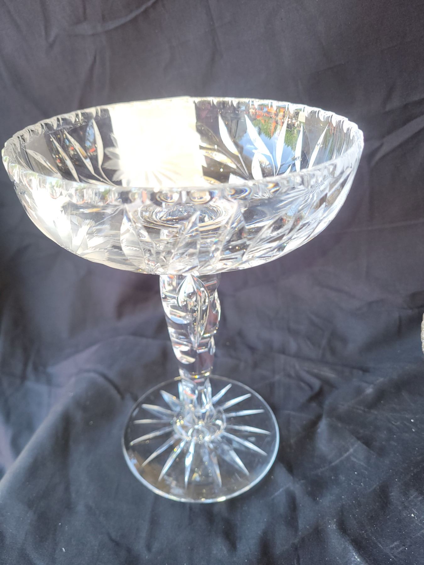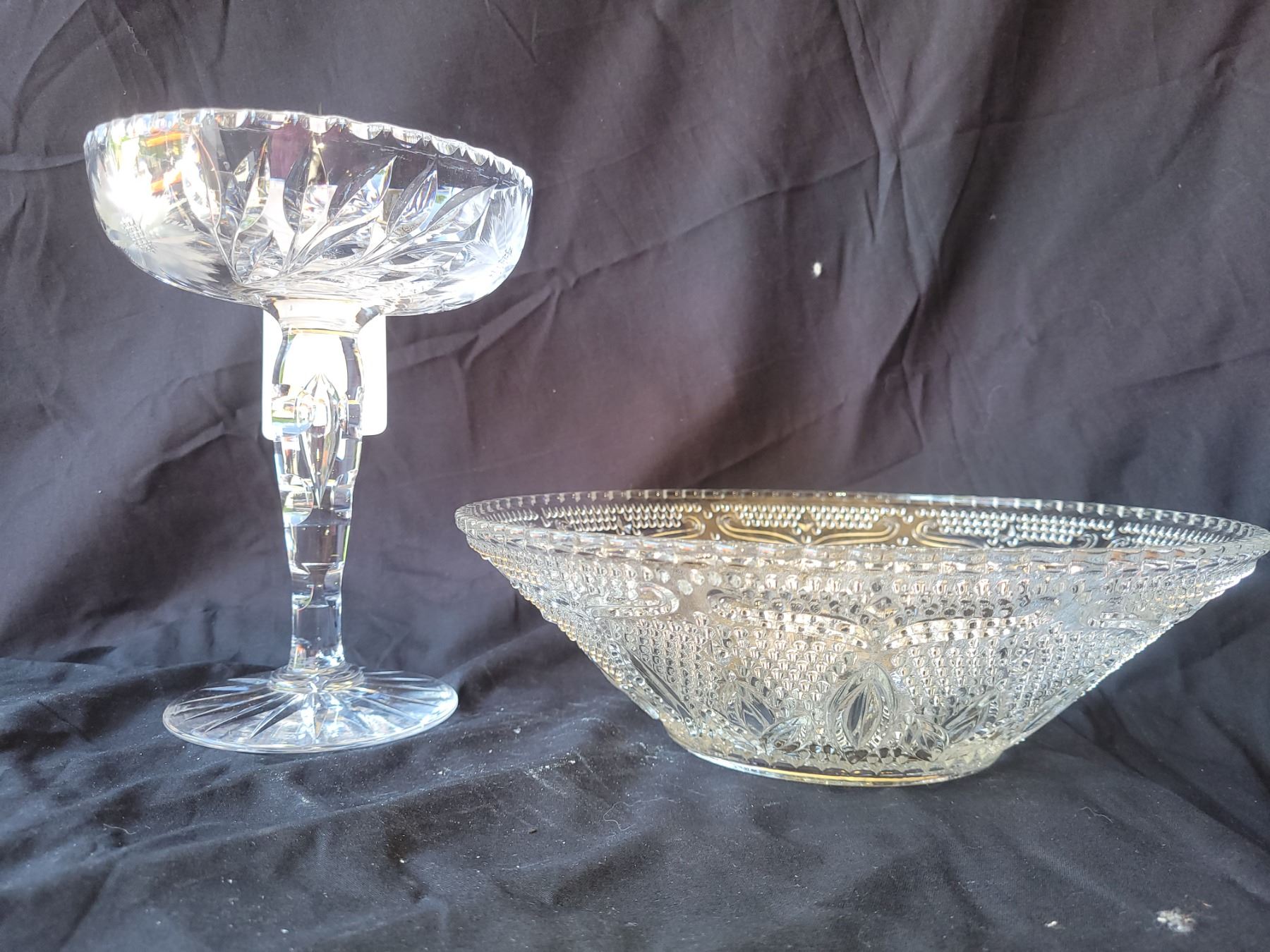Footed candy dish 6x6x8 and open cut glass serving bowl 10x10x3 Pickup at 9 am