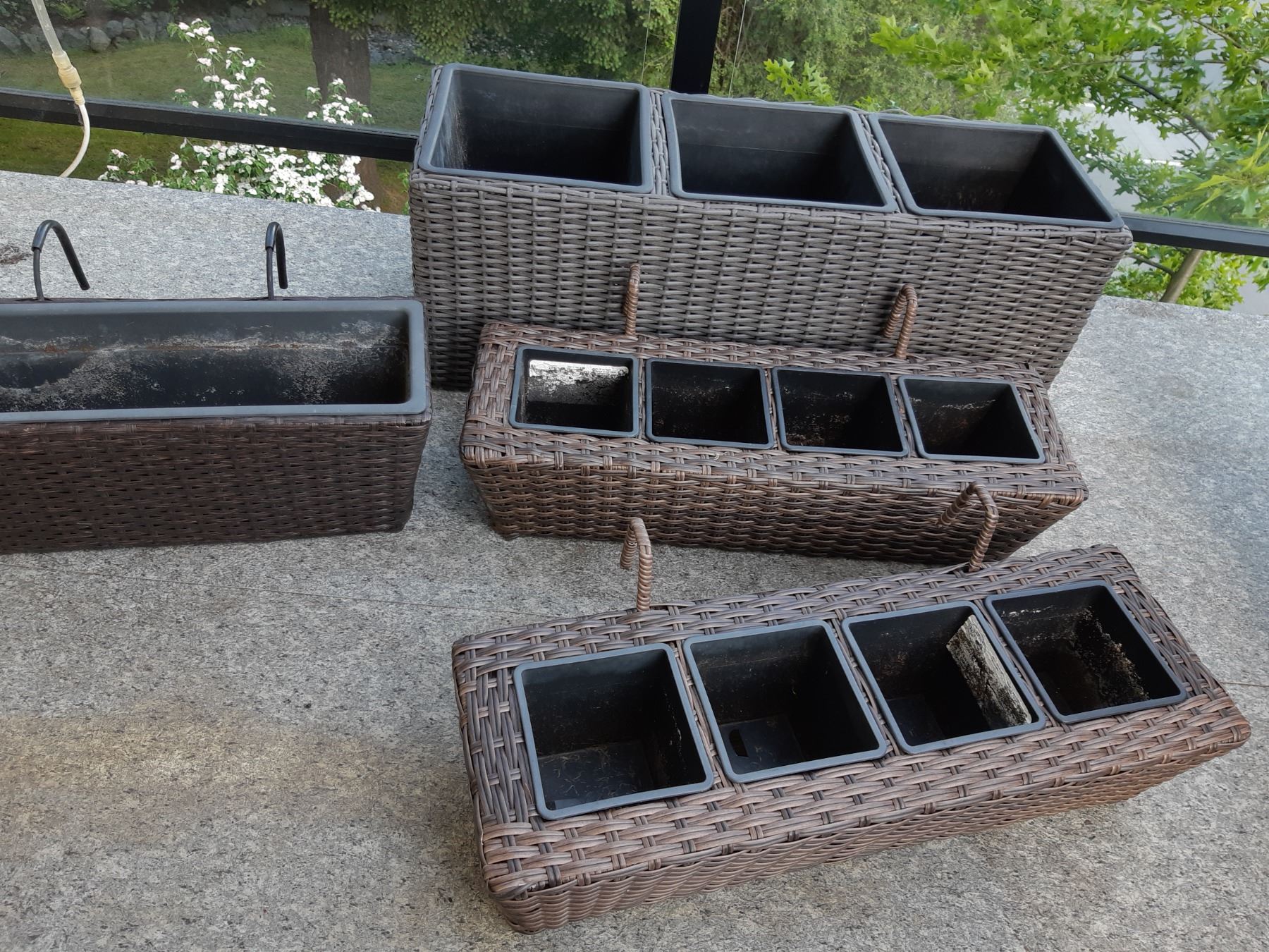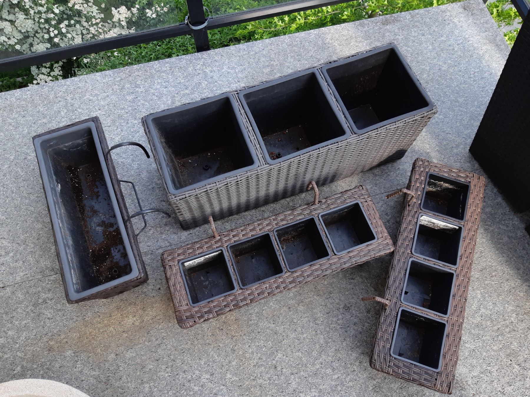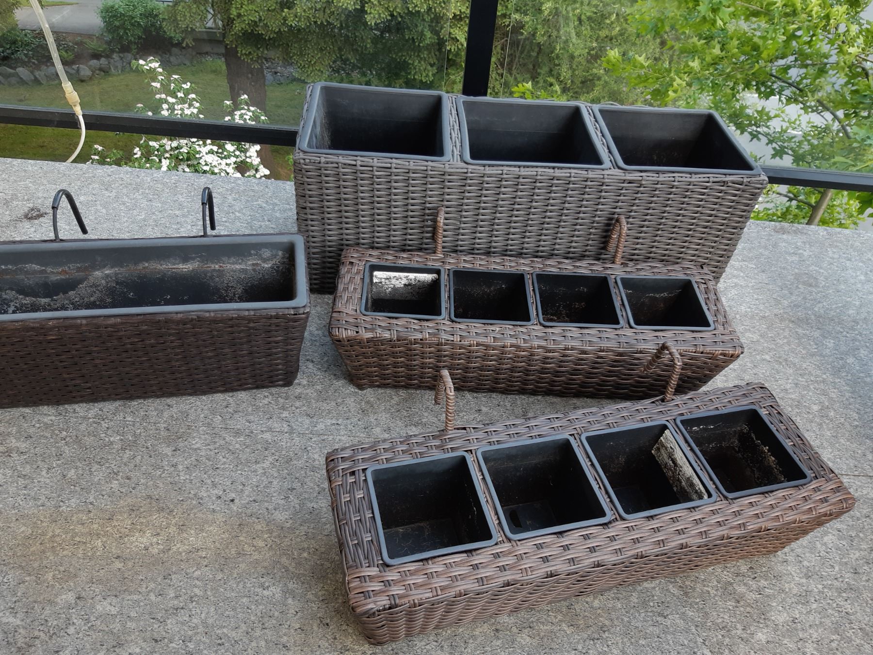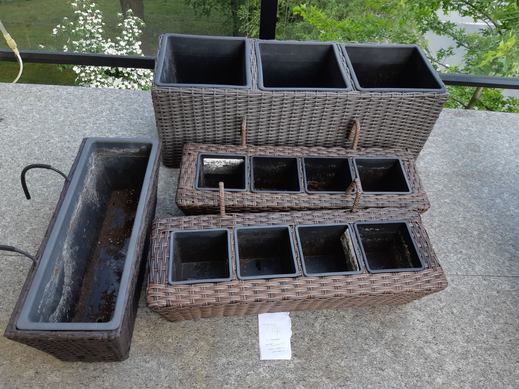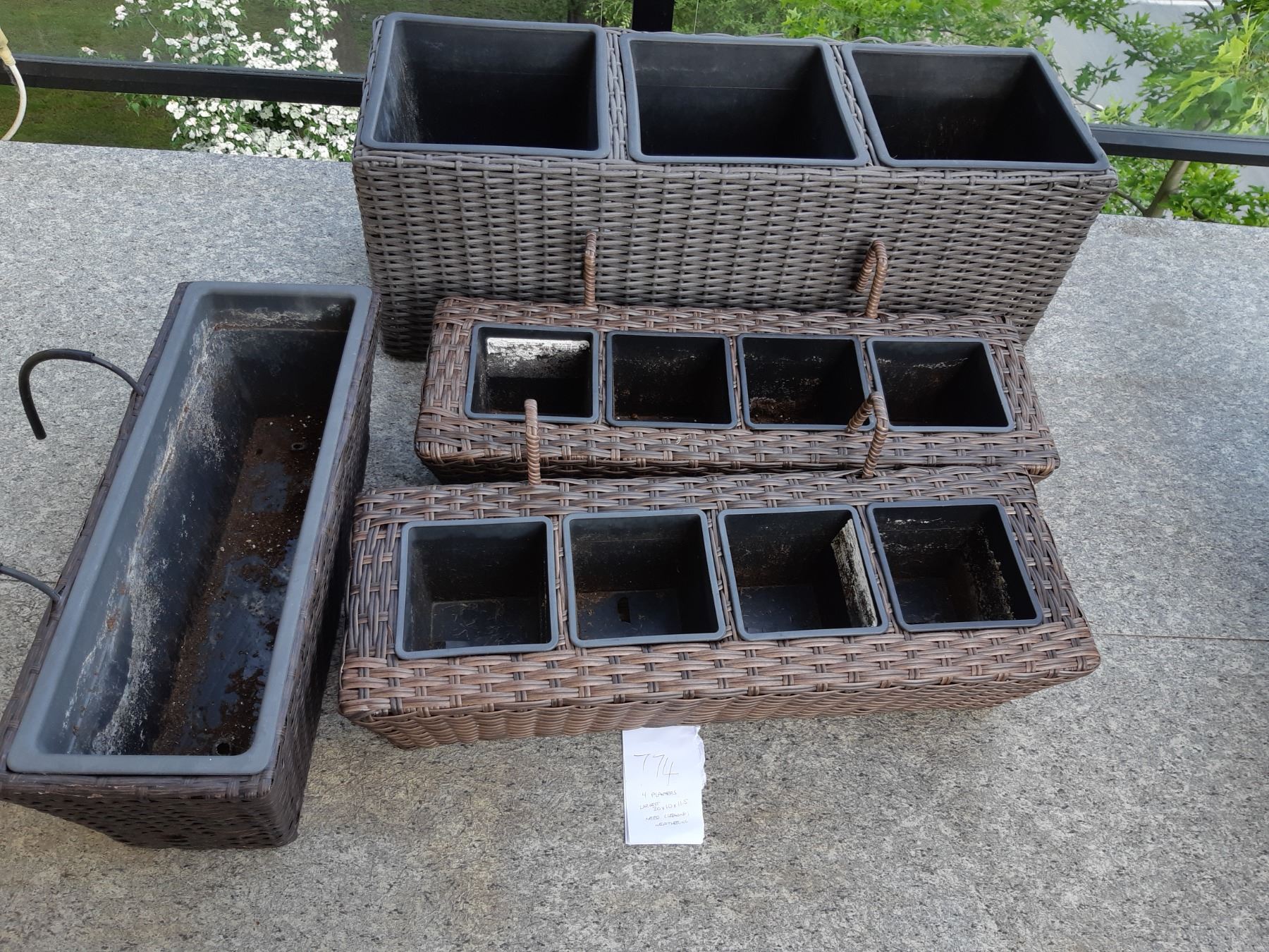 Largest holds 3 plants 30x10x11. 3 over the rail plant containers. Pickup at 1:30
