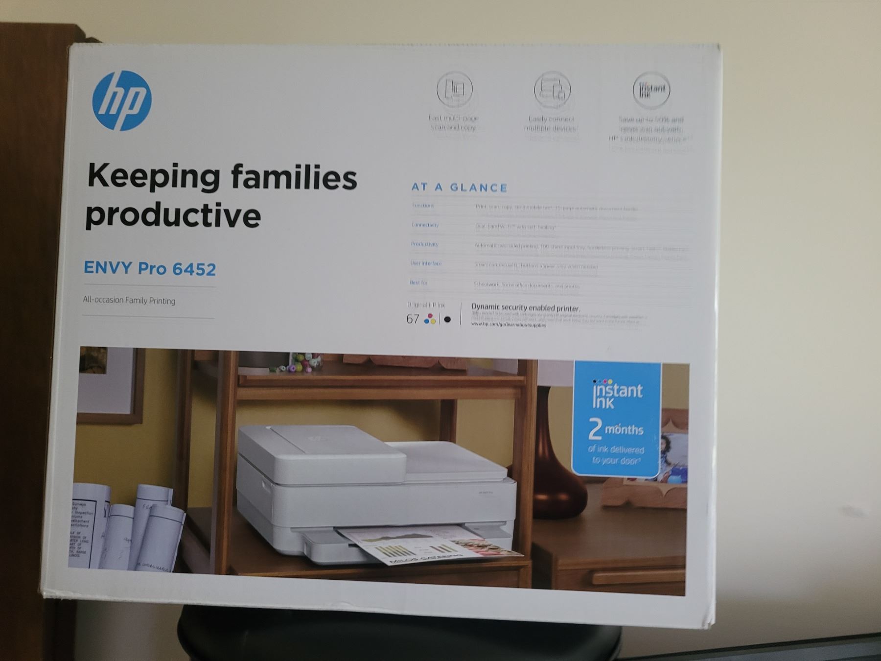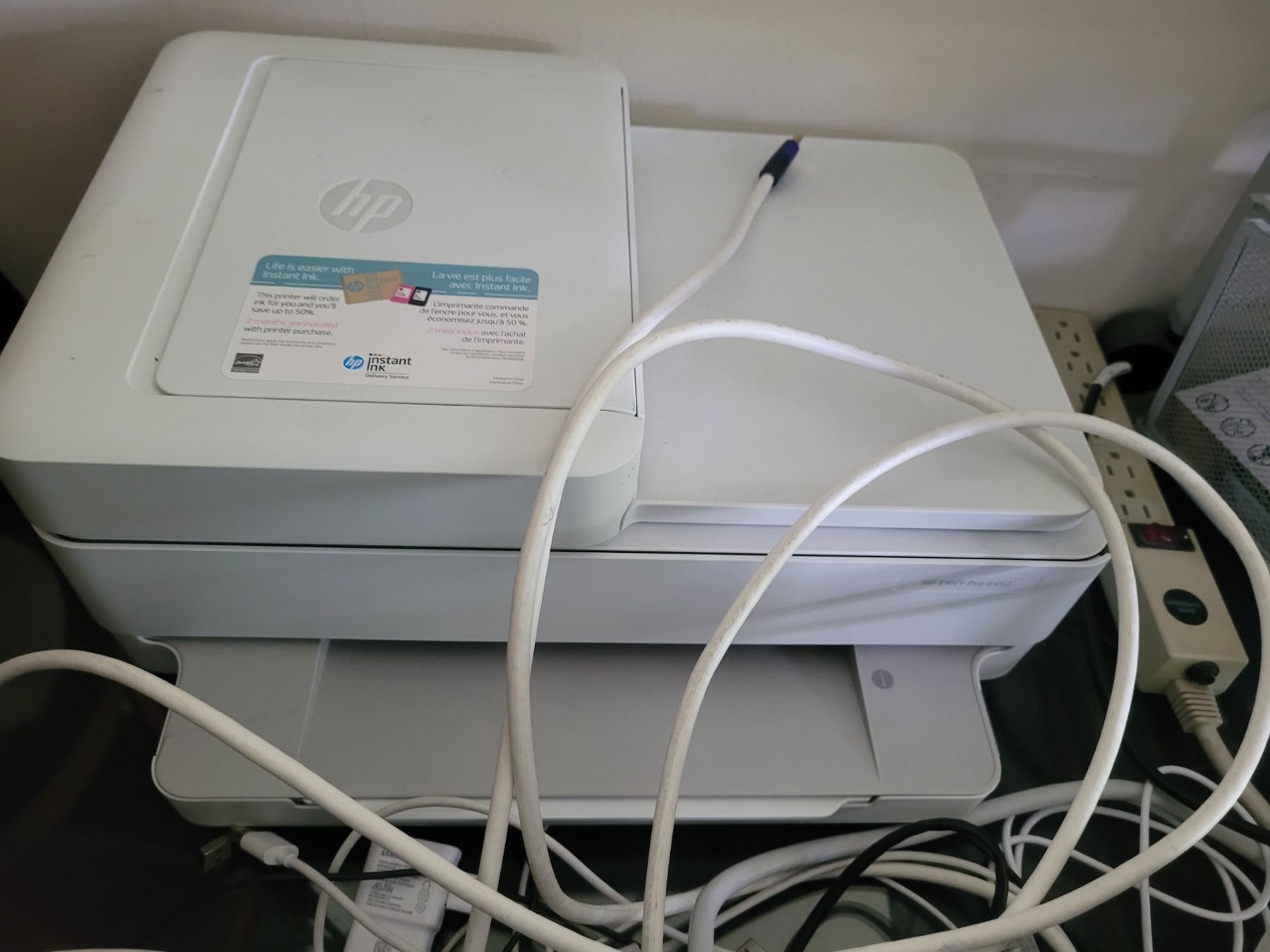 HP Envy Pro 6452 printer, Dell monitor, bar stool, wire cart on wheels, stationary supplies, more. Pick up 9-10