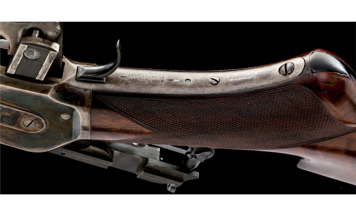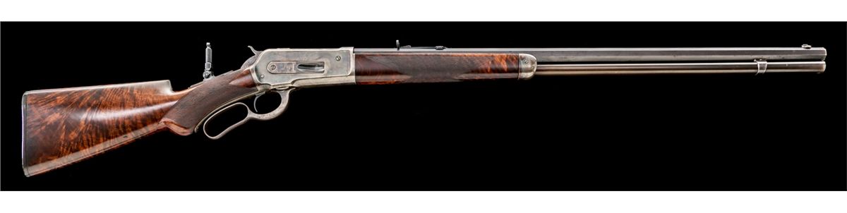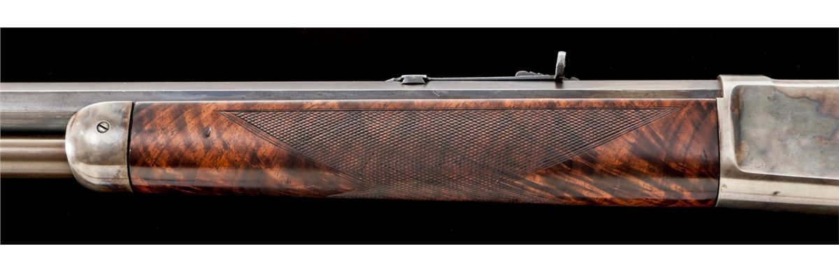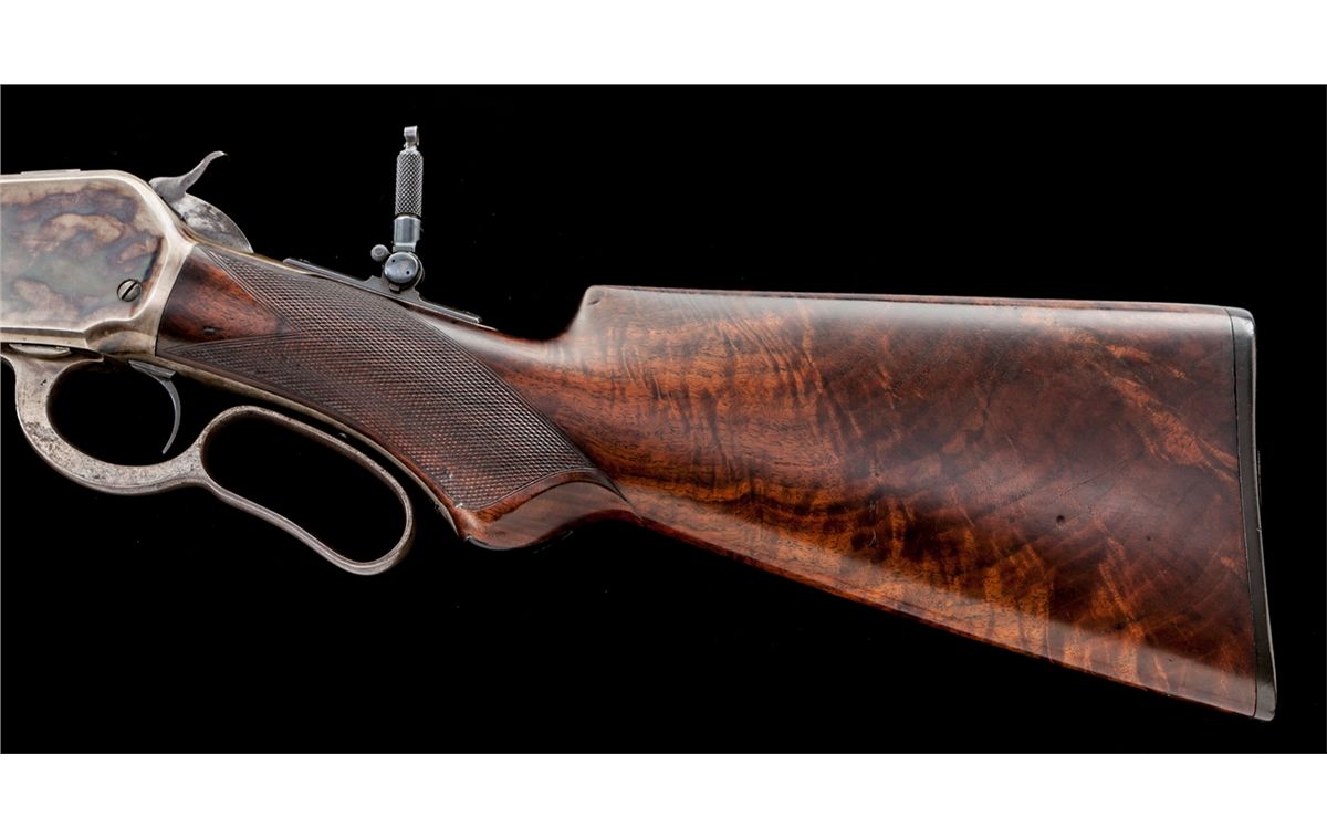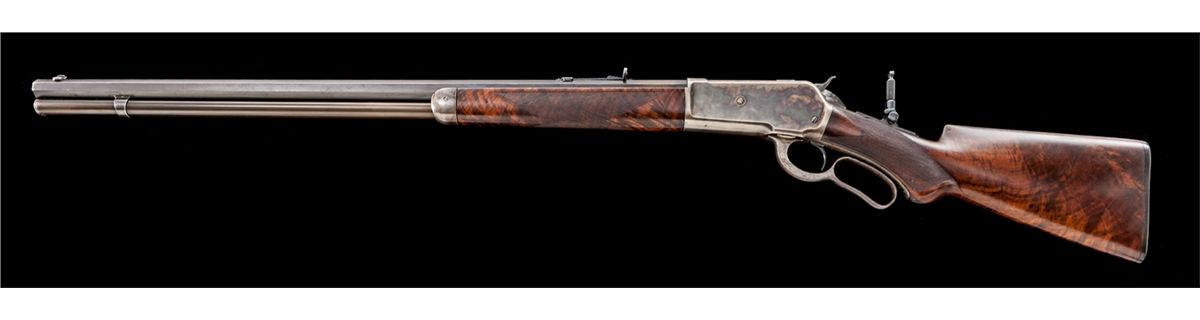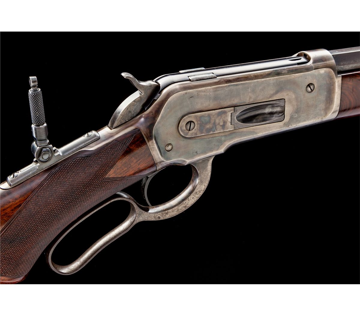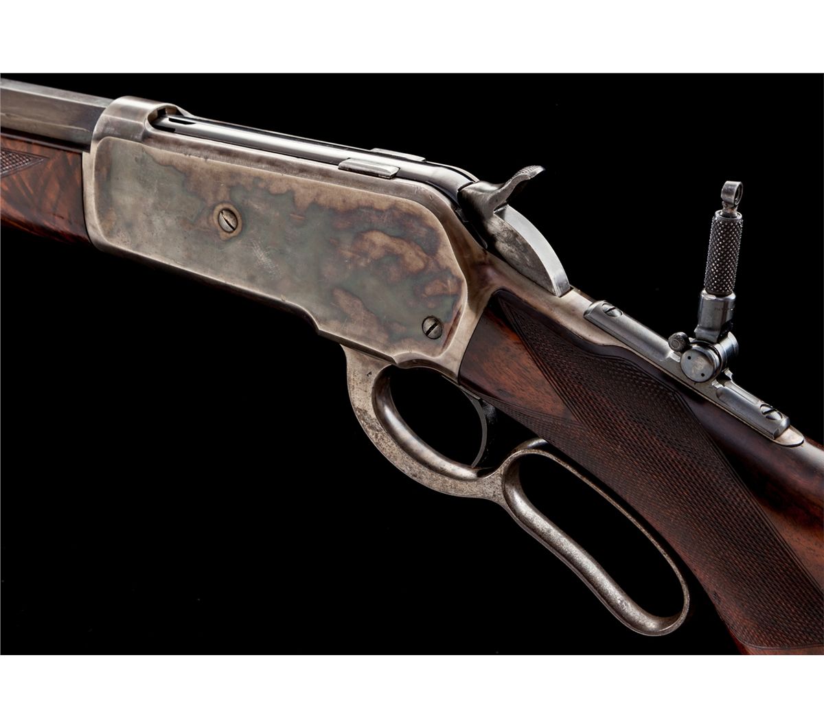 Antique Deluxe Special Order Winchester Model 1886 Lever Action Rifle, #68465, .40-65 cal., 28'' octagonal barrel, blue and case hardened finish, plain trigger, checkered pistol-grip oil-finished walnut stock with shadow line carved to bottom of pistol grip and ebony insert at cap; left side of lower tang marked ''XXOF'' for type of wood and finish, Lyman front and rear sights, shotgun butt with hard rubber buttplate. Shipped July 11, 1892, with factory letter verifying all features. Condition is excellent. Barrel and mag tube retain approx. 92% lightly thinning and toning blue, mostly just behind rear sight. Case hardened frame with 85%-90% vivid hues, with even smoothing at balance point, still showing faint colors, as well as micro-scratching to both sides. Oil-finished stock shows only light pressure dings and minor shrinkage to forend and some flattening to checks. Forend cap retains approx. 90% lightly thinning but still vibrant case colors. Front sight is missing its brass bead. Action is smooth, bore is mirror bright. An exceptional Deluxe Special Order '86 showing little field use and twelve decades of minor handling. Est.: $22,500-$27,500. (Antique)