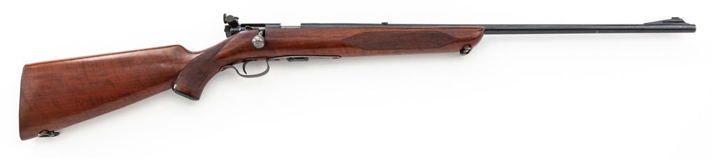 Deluxe Winchester Model 75 Bolt Action Rifle, #51627, .22 LR cal., 24'' barrel, blue finish, checkered pistol-grip walnut stock, sling swivels, with Lyman receiver sight and gold bead front sight. Triggerguard just forward the magazine marked ''Sporting''. Mfg'd 1948. Condition is excellent retaining approx. 96% blue, with edgewear to receiver sight. Stock with nice select figure and minor bruises to checkered portions. Smooth action, fine bore. Est.: $500-$750. (C&R)