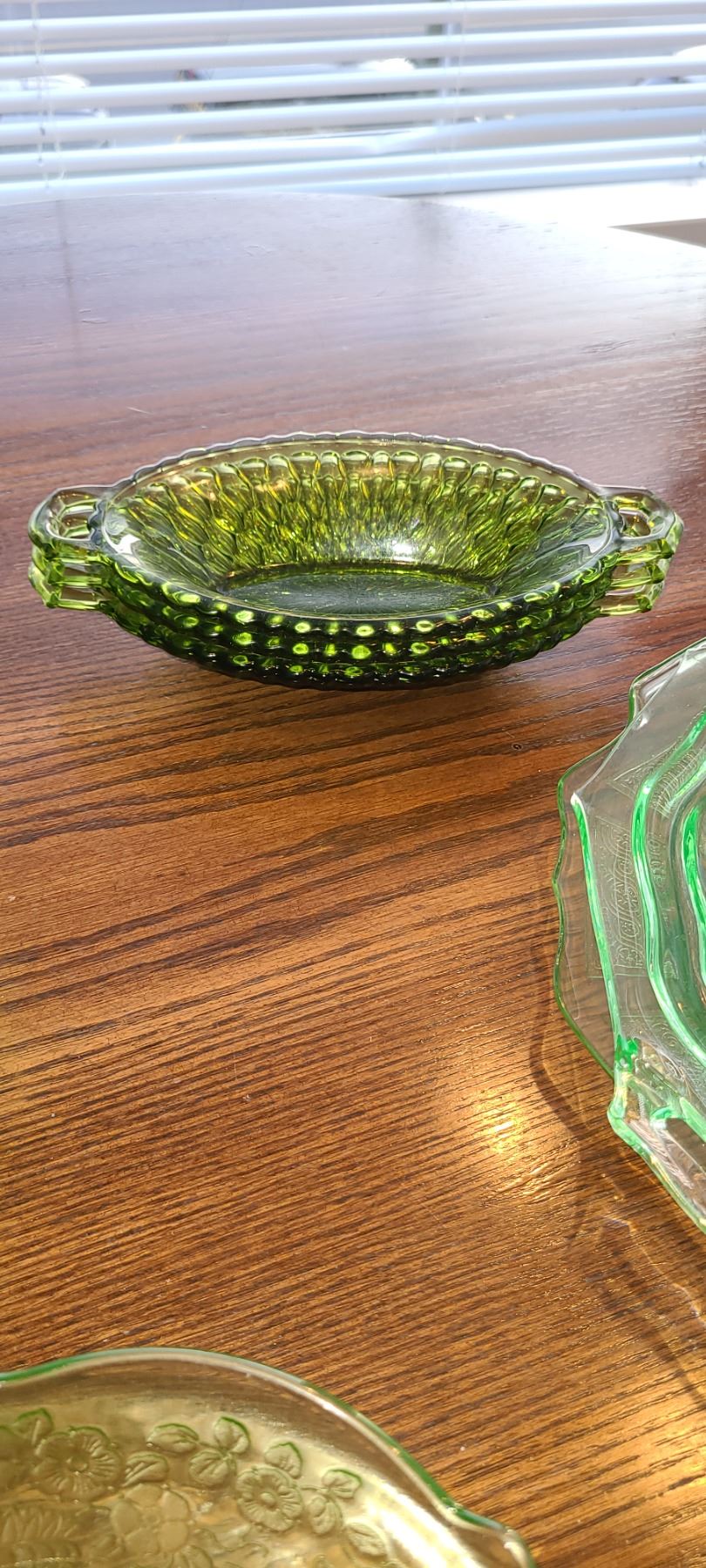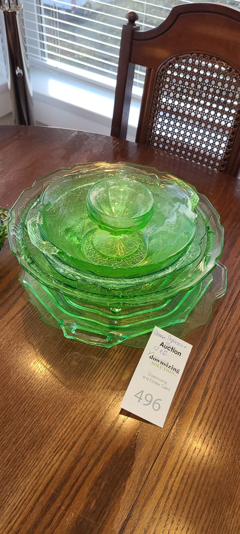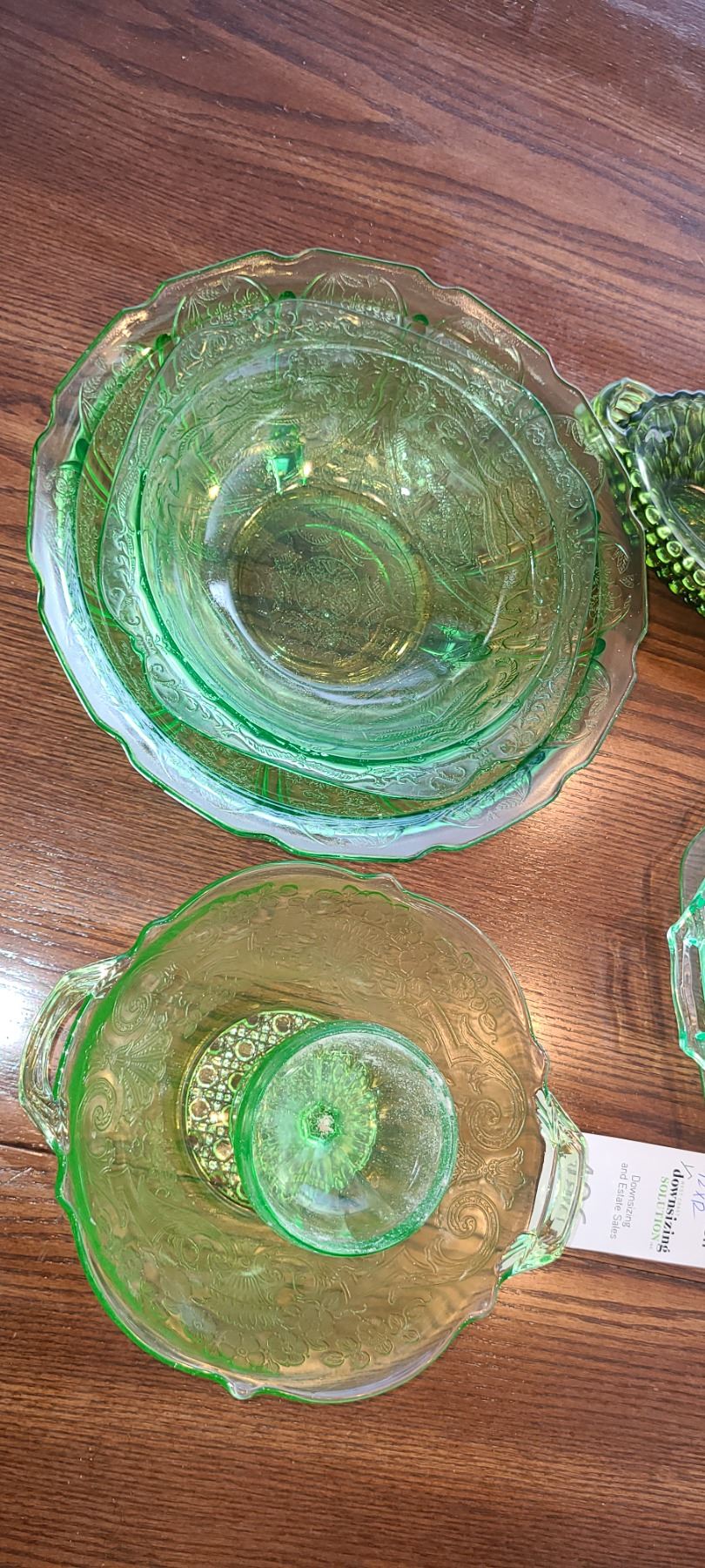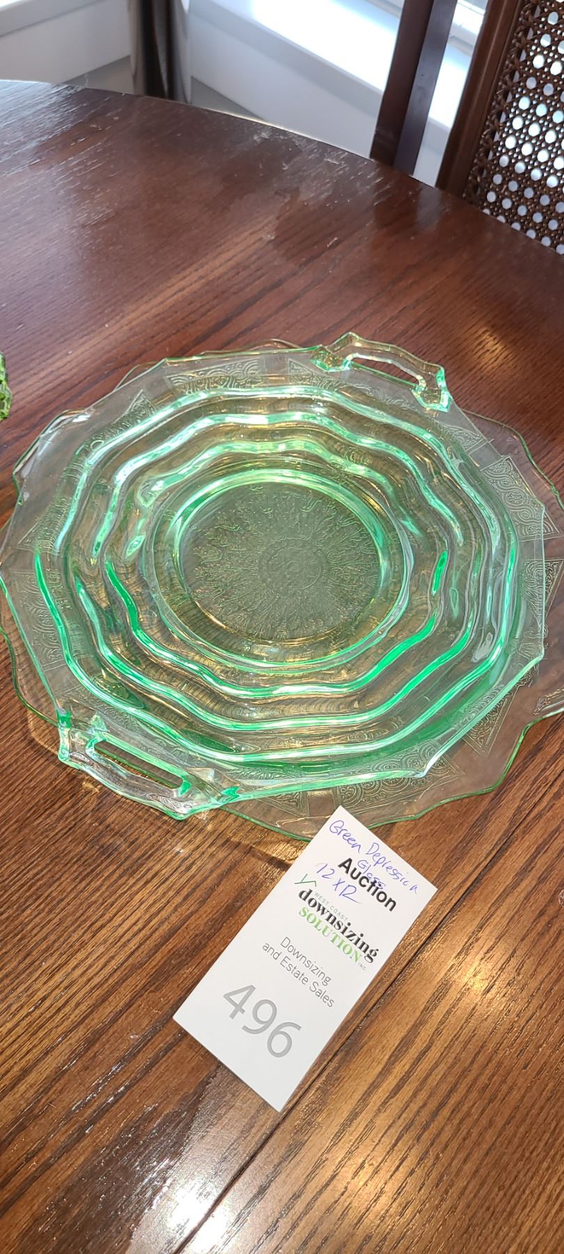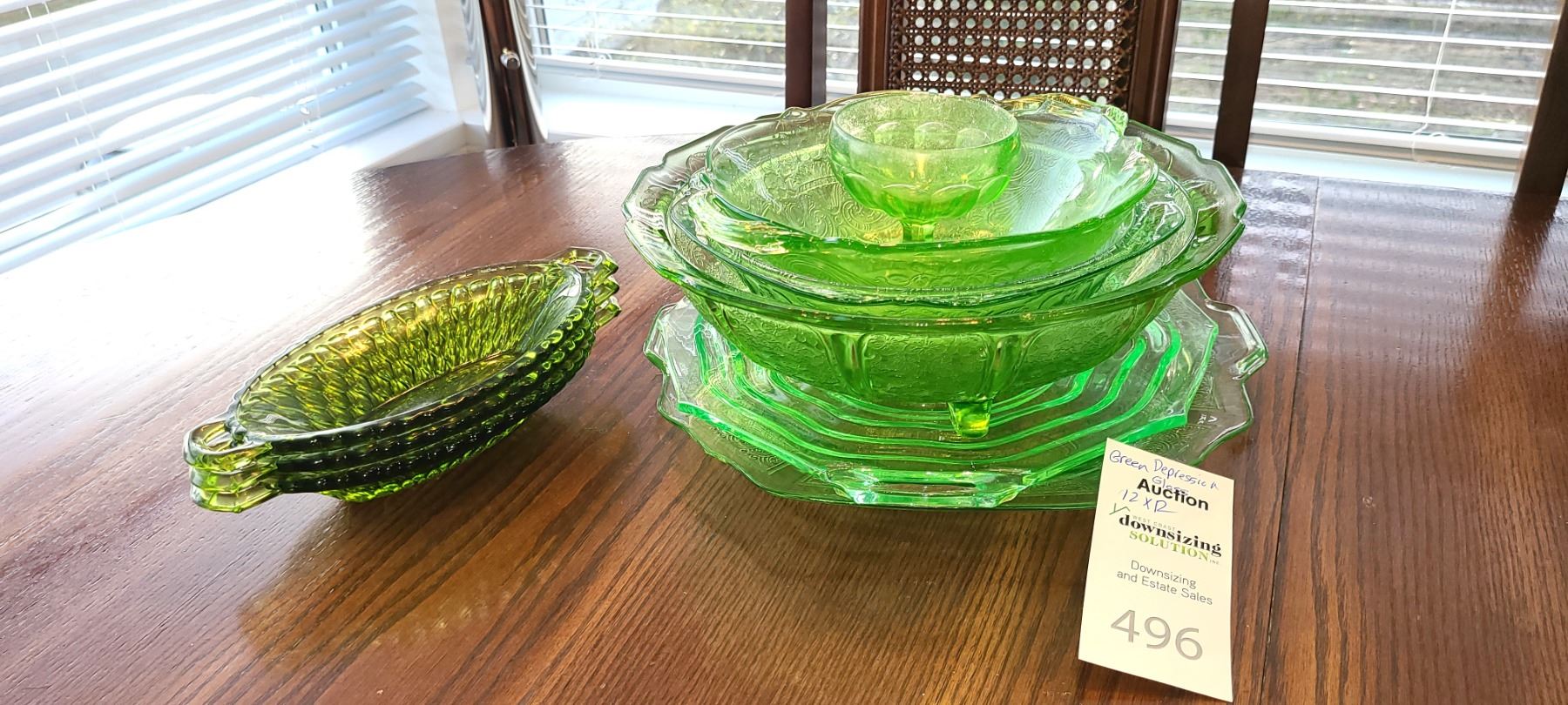 Collection of green depression glass. Largest 12x12. Pick up 9-10. Bring packing material.