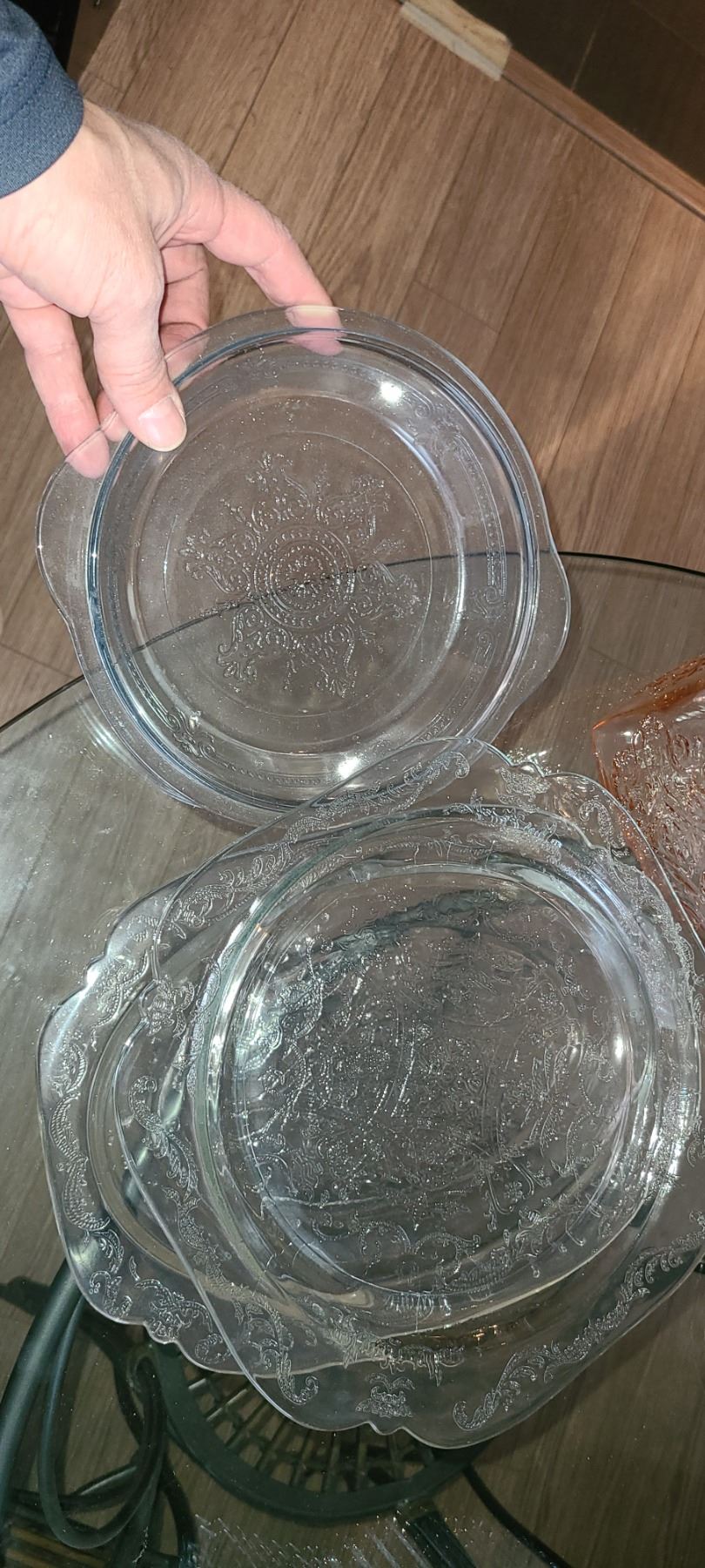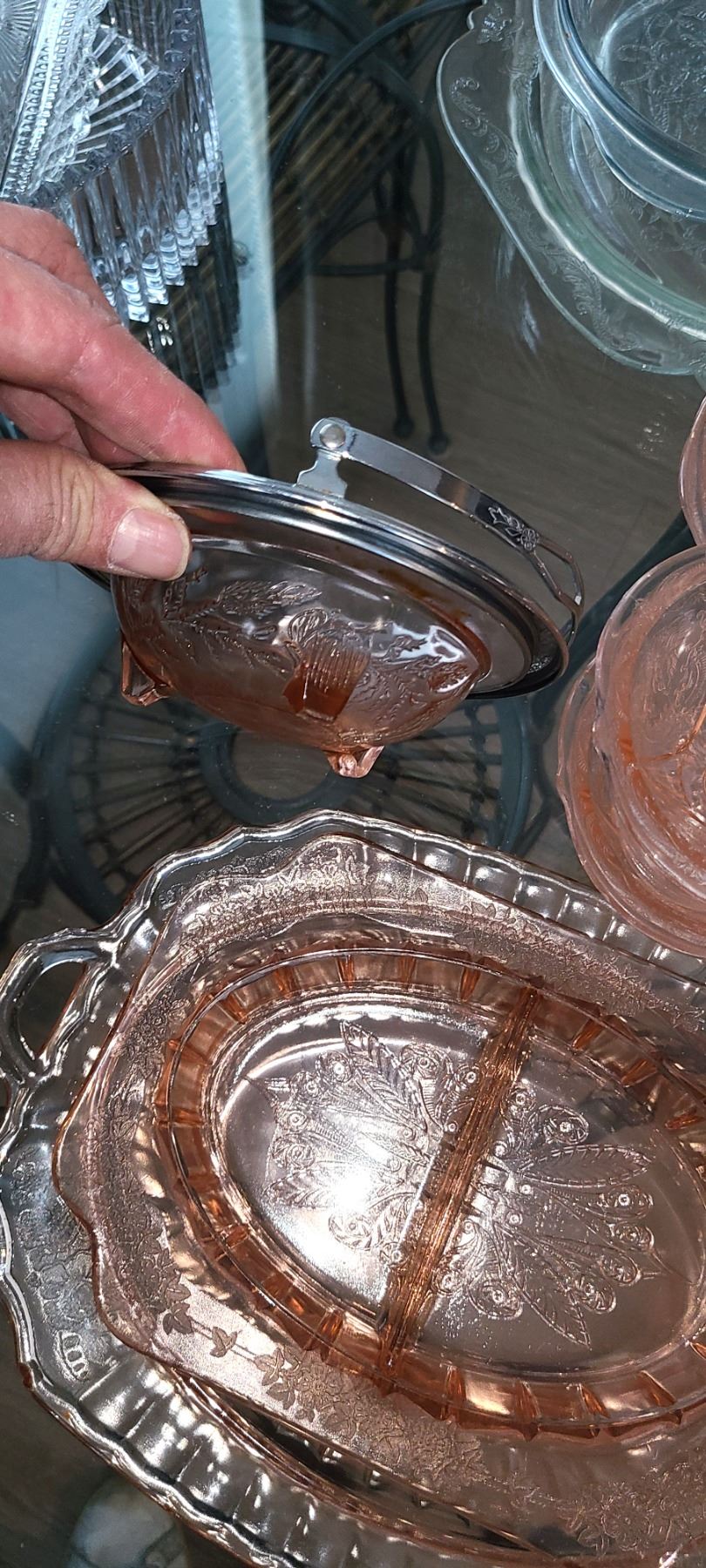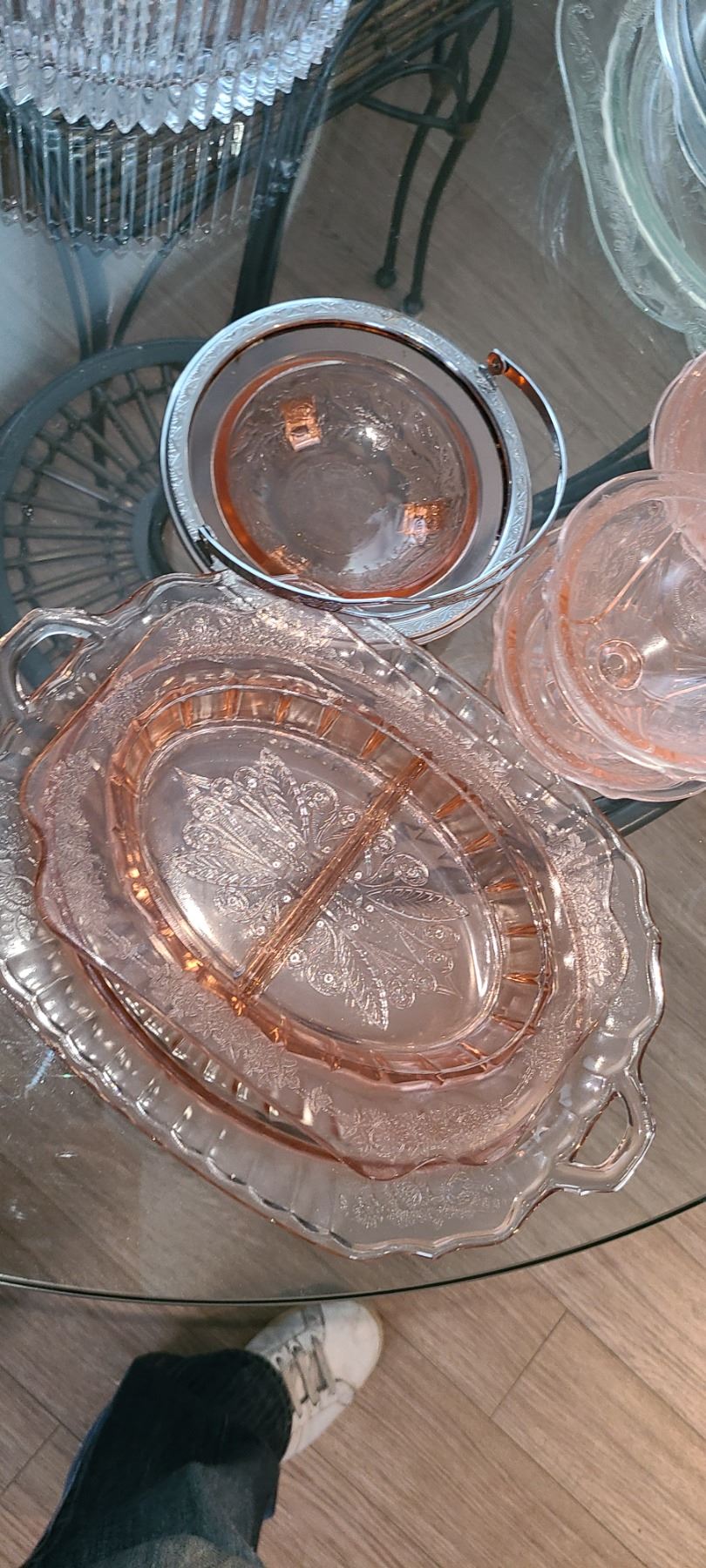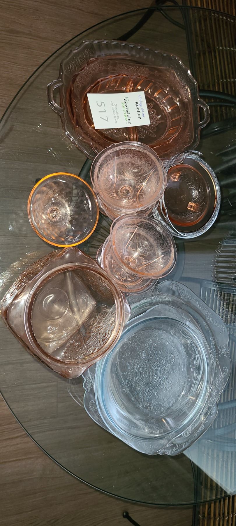 Assortment of pink, amber & clear depression glass, plate 12x12. Bring packing and pickup at 9 am