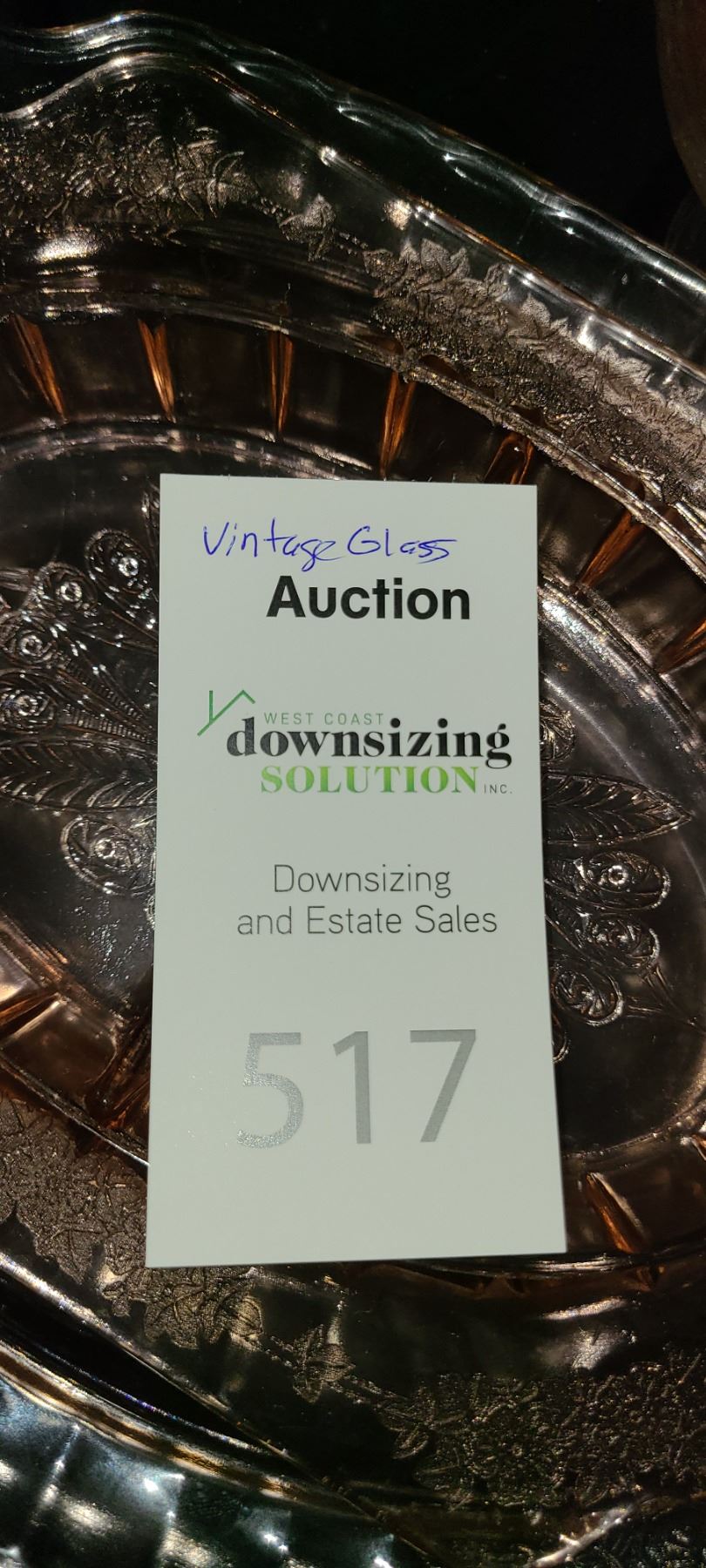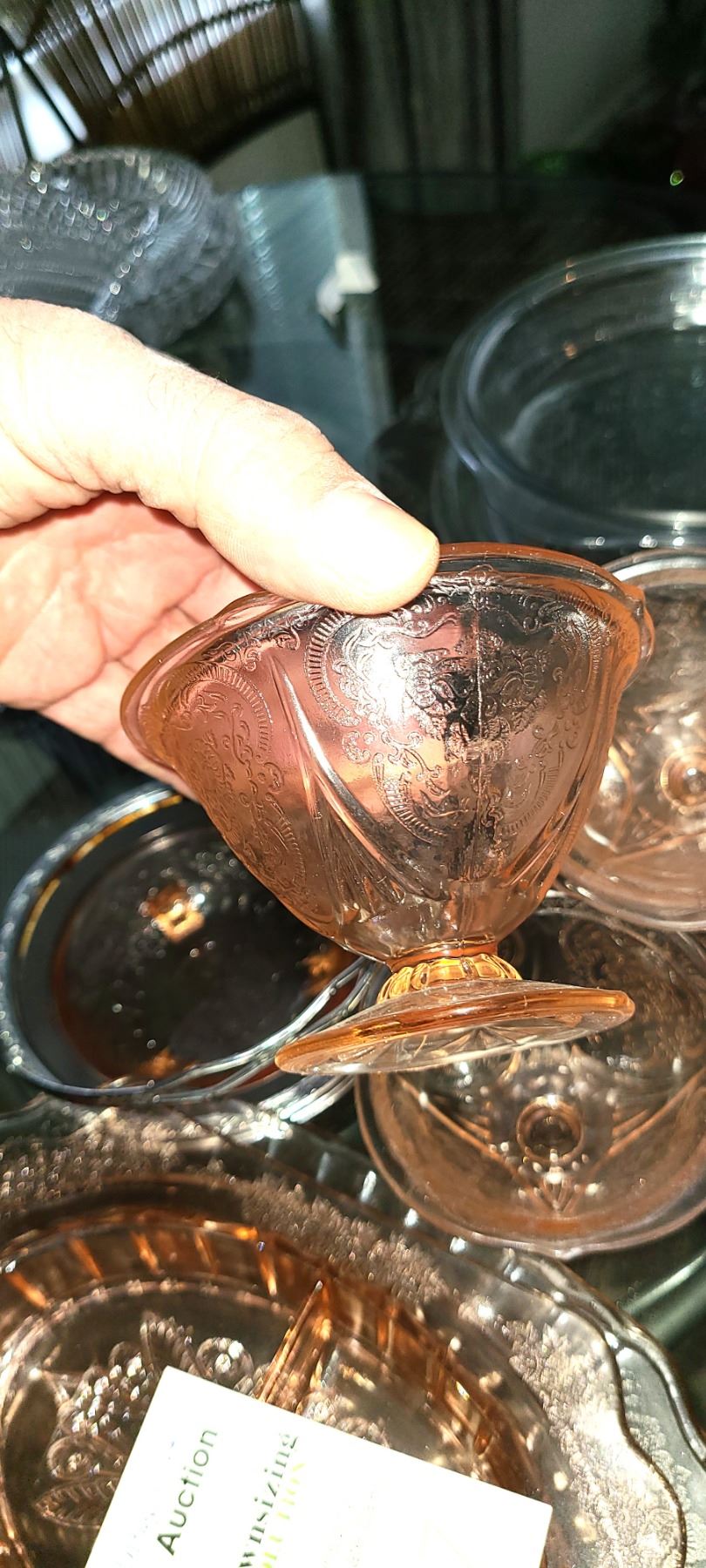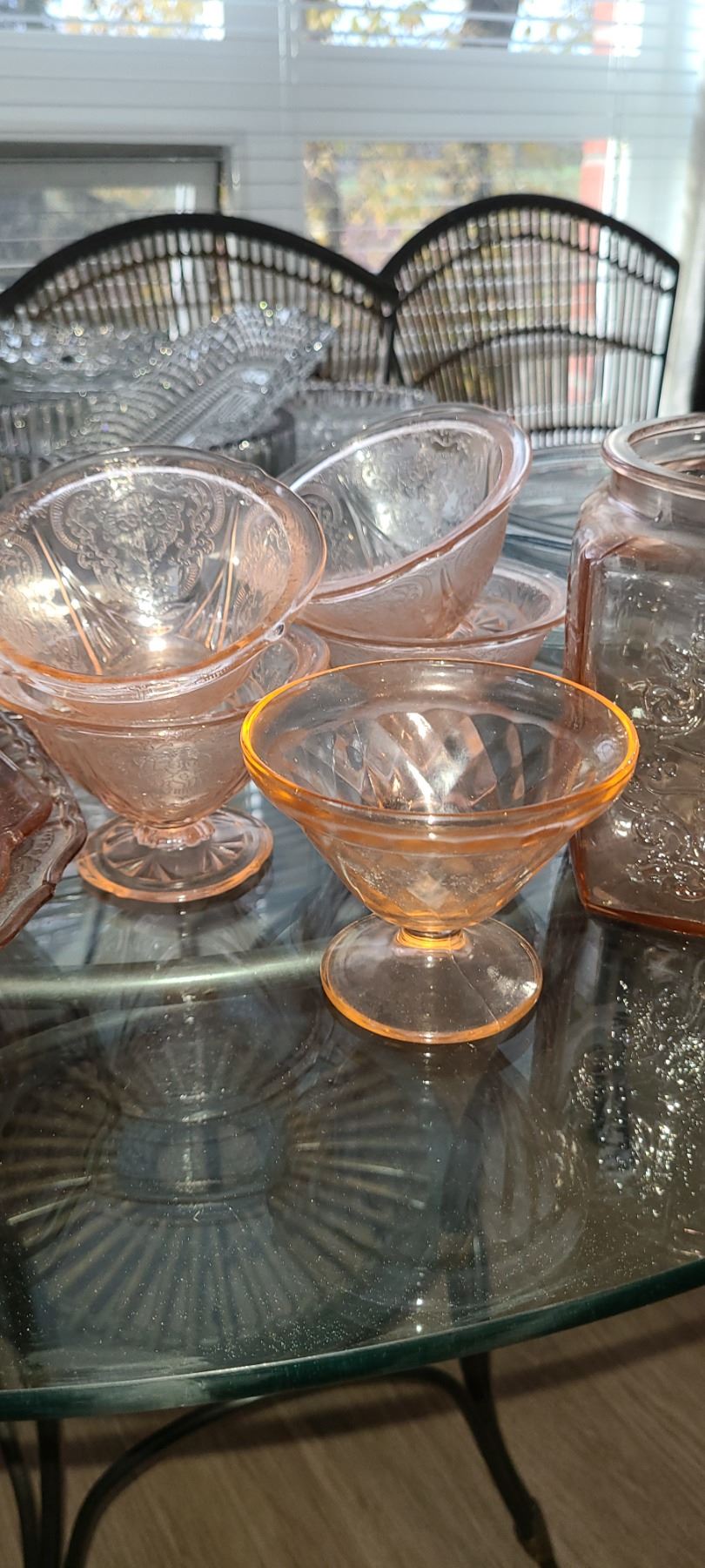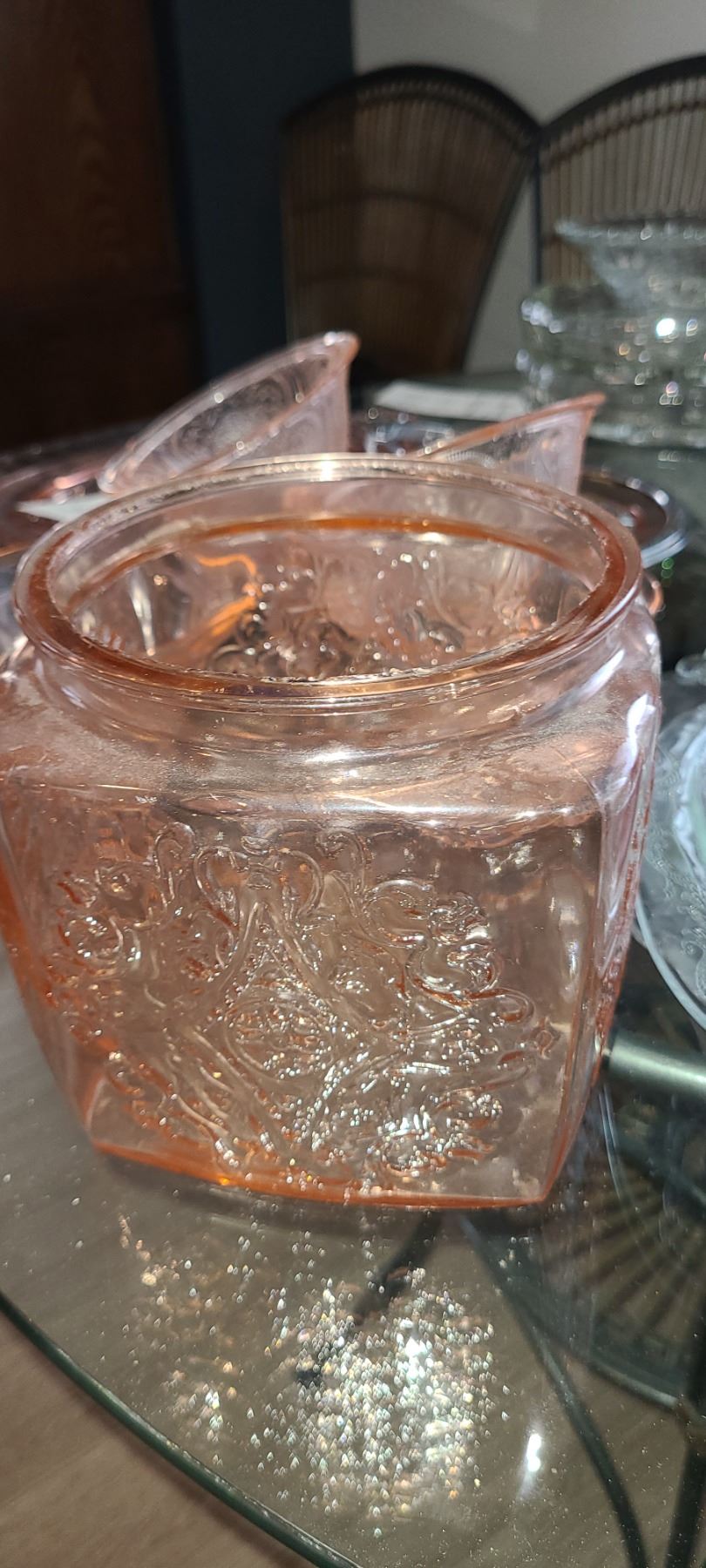 Assortment of pink, amber & clear depression glass, plate 12x12. Bring packing and pickup at 9 am