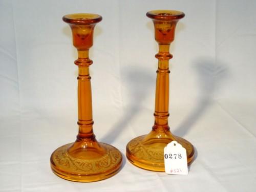 PR AMBER GLASS GILT DECORATED CANDLESTICKS