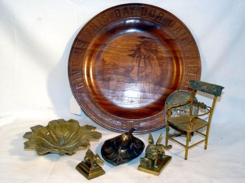 TRAY LOT METAL ITEMS INCL BRONZE LION, TOLE CHAIR, AND COCK FIGHTING PLAQUE