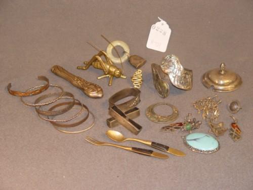 TRAY LOT WITH BRASS GRASSHOPPER, STERLING JEWELRY, ETC.