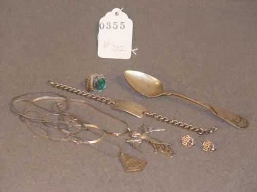 TRAY LOT STERLING JEWELRY, COIN SPOON, ETC.
