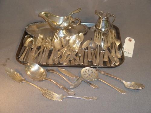 TRAY LOT PLATED FLATWARE, GRAVY BOAT, ETC.