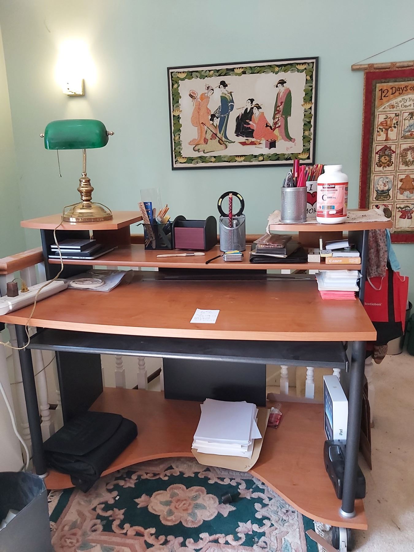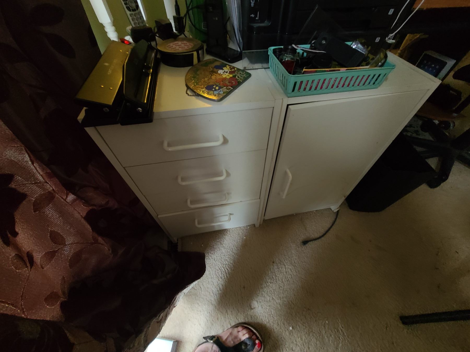 Desk, 46X28X29 cupboards 16X20X27 Epson printer and contents. Bring boxes and pickup at 11 am