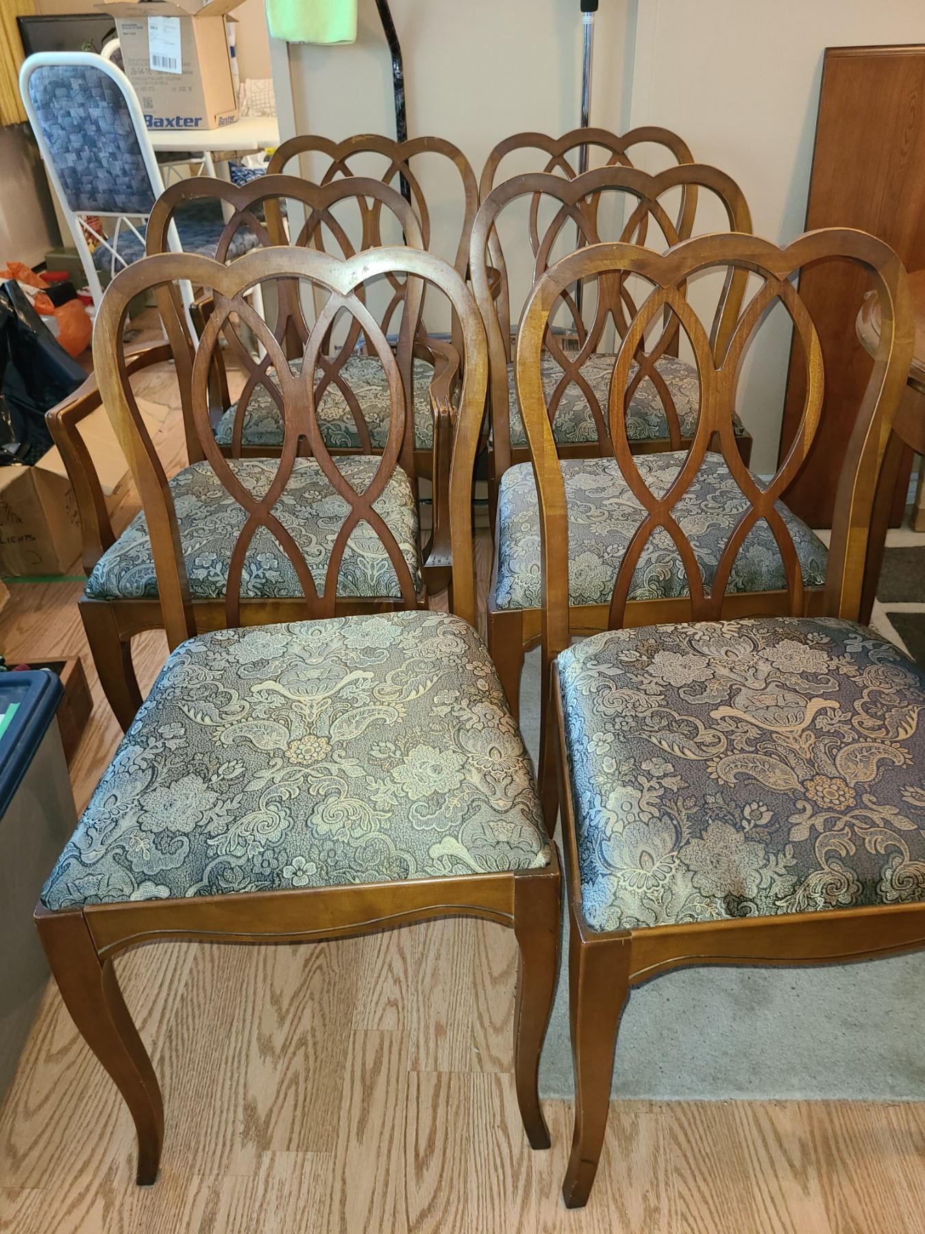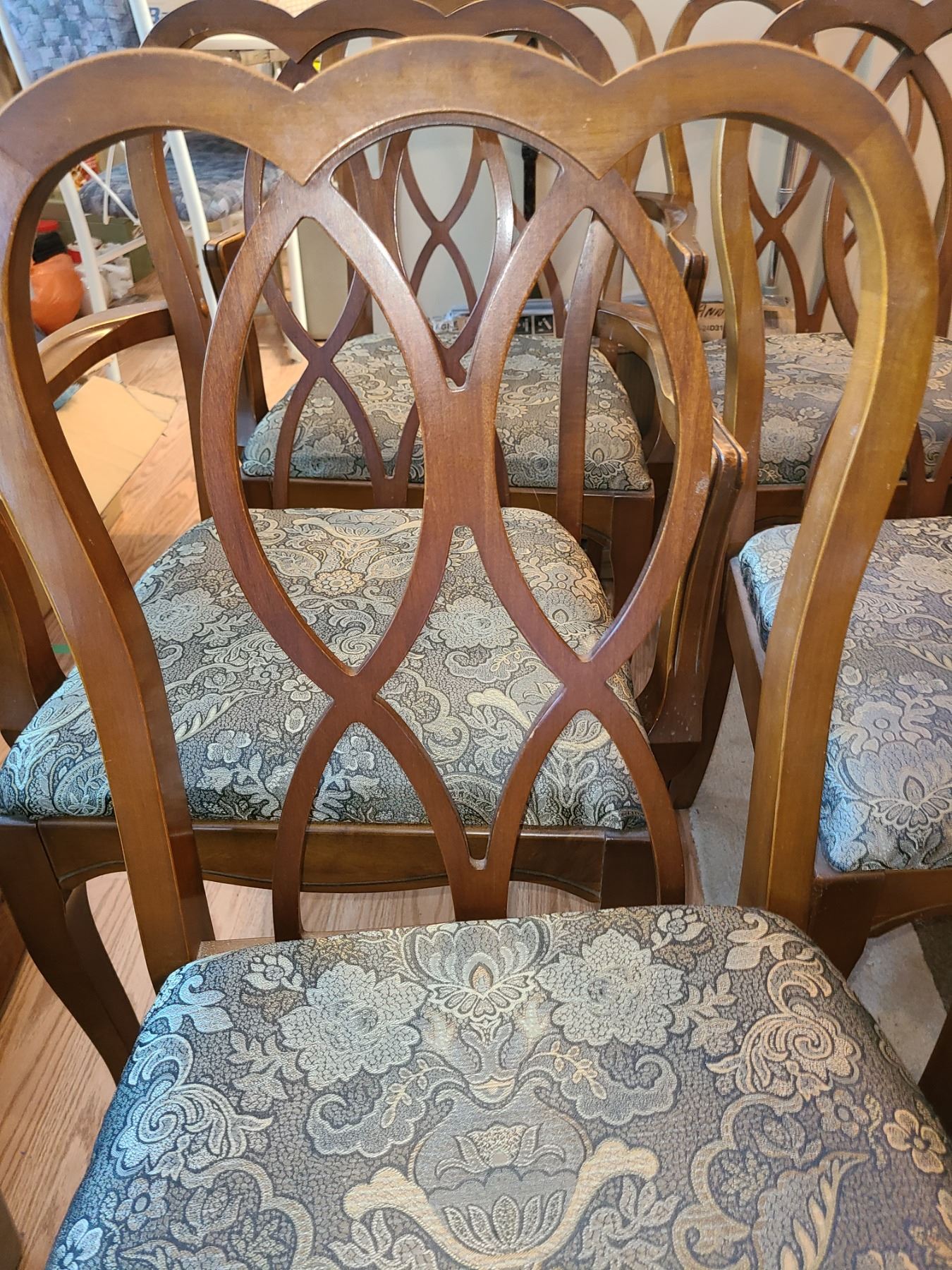 Six ornate dining chairs to match lot 691, 18x20x35. Please note scratches on some chairs. Bring help to move. Pickup 11 am.