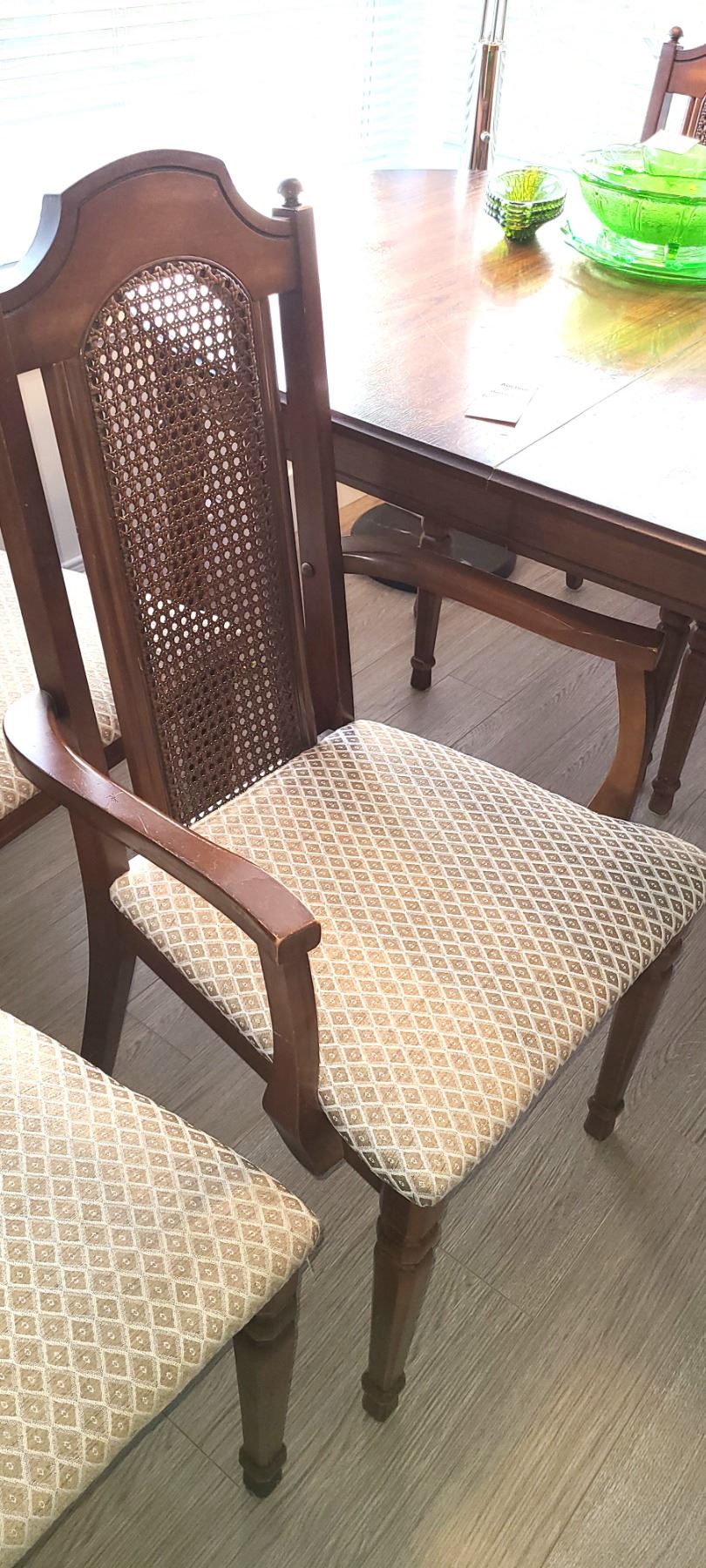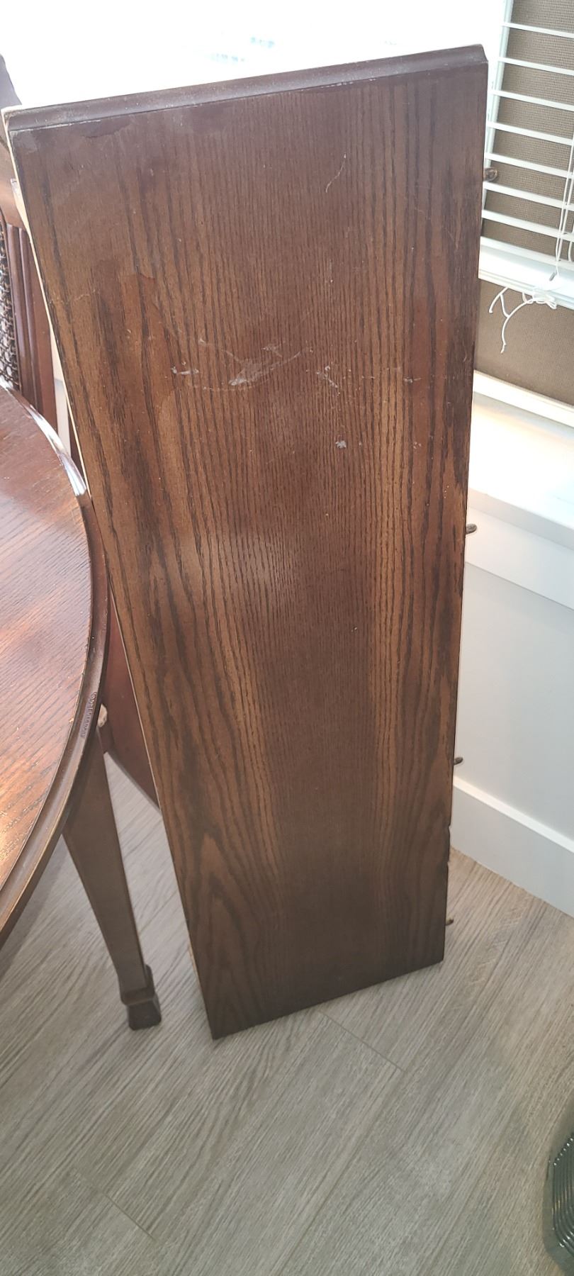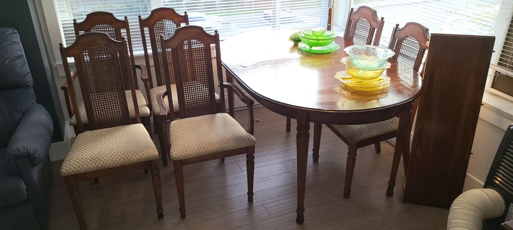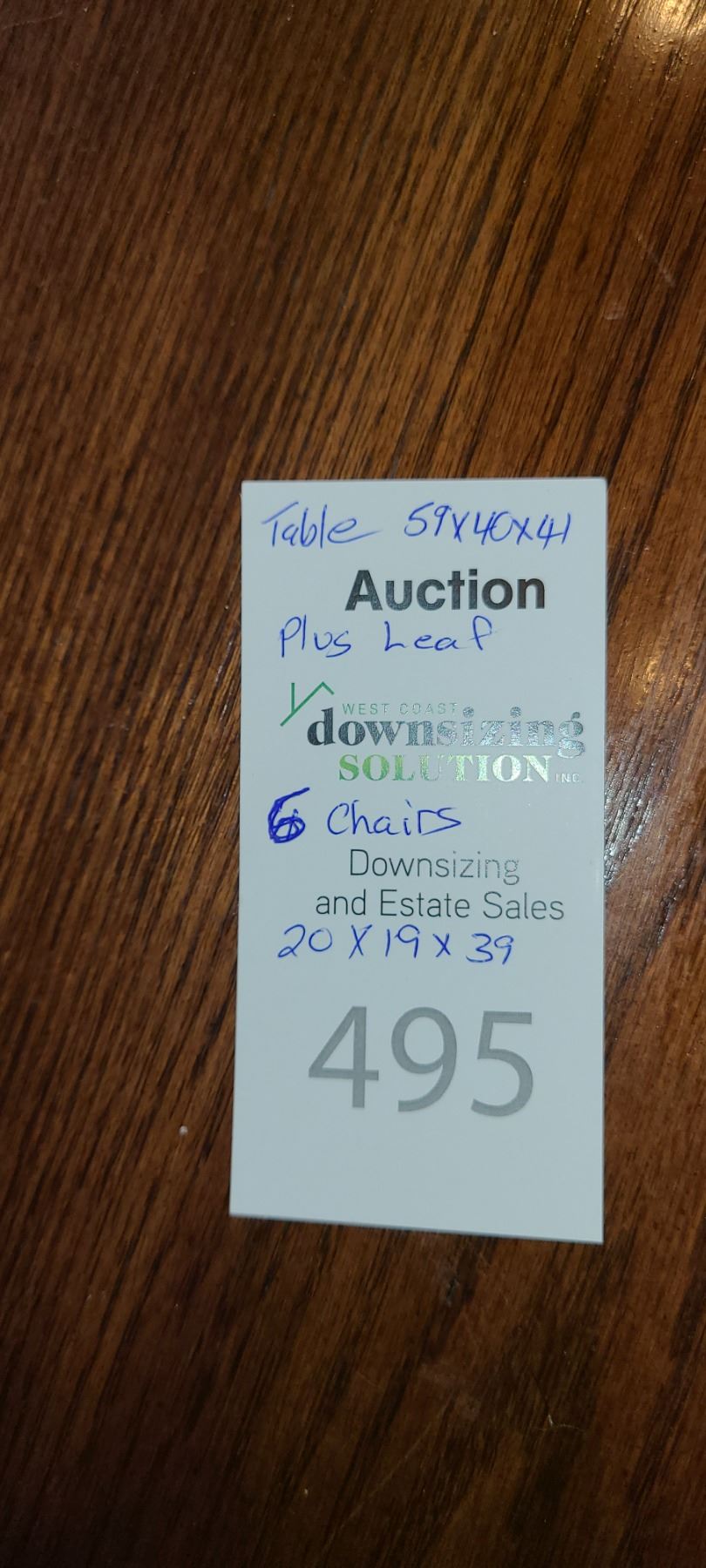 Includes table 59x40x41, plus leaf. 6 chairs 20x19x39. Bring help to remove. Pick up 11-12
