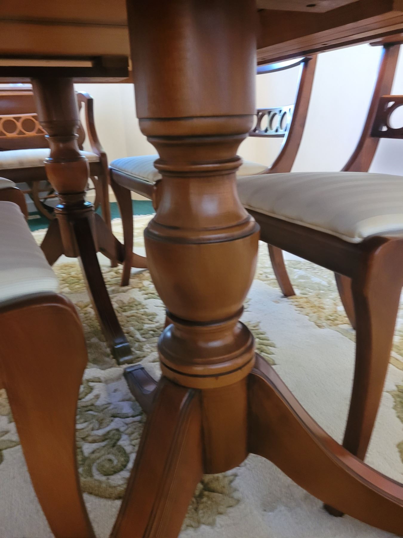 Solid wood dining table with three leaves (12" ea), 42x62x29 without leaves. Chairs 21x23x34. Bring help to carry out. Pick up 12:30