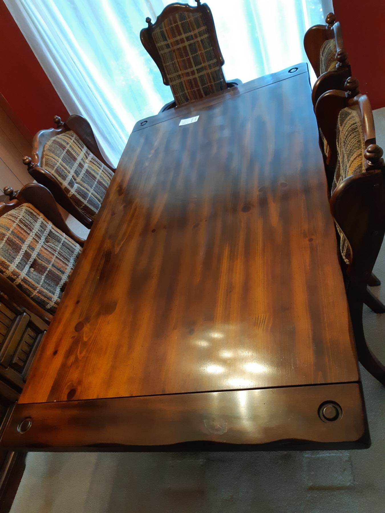 Parsons table with 2 leaves that fit on each end. 70x38x30. Leaves 25x38 2 captain chairs and 4 regular chairs. note scratches and pickup at 11 am