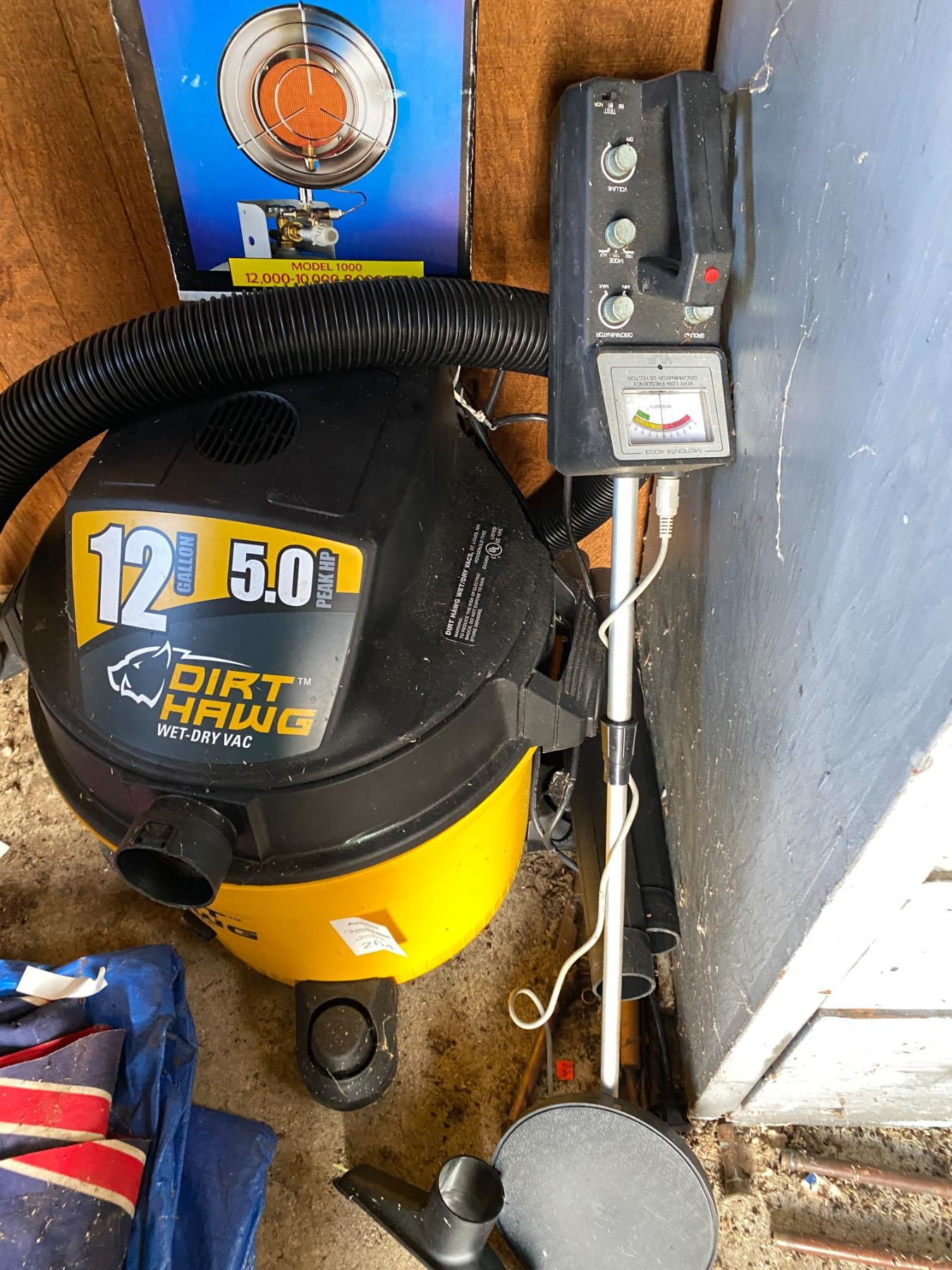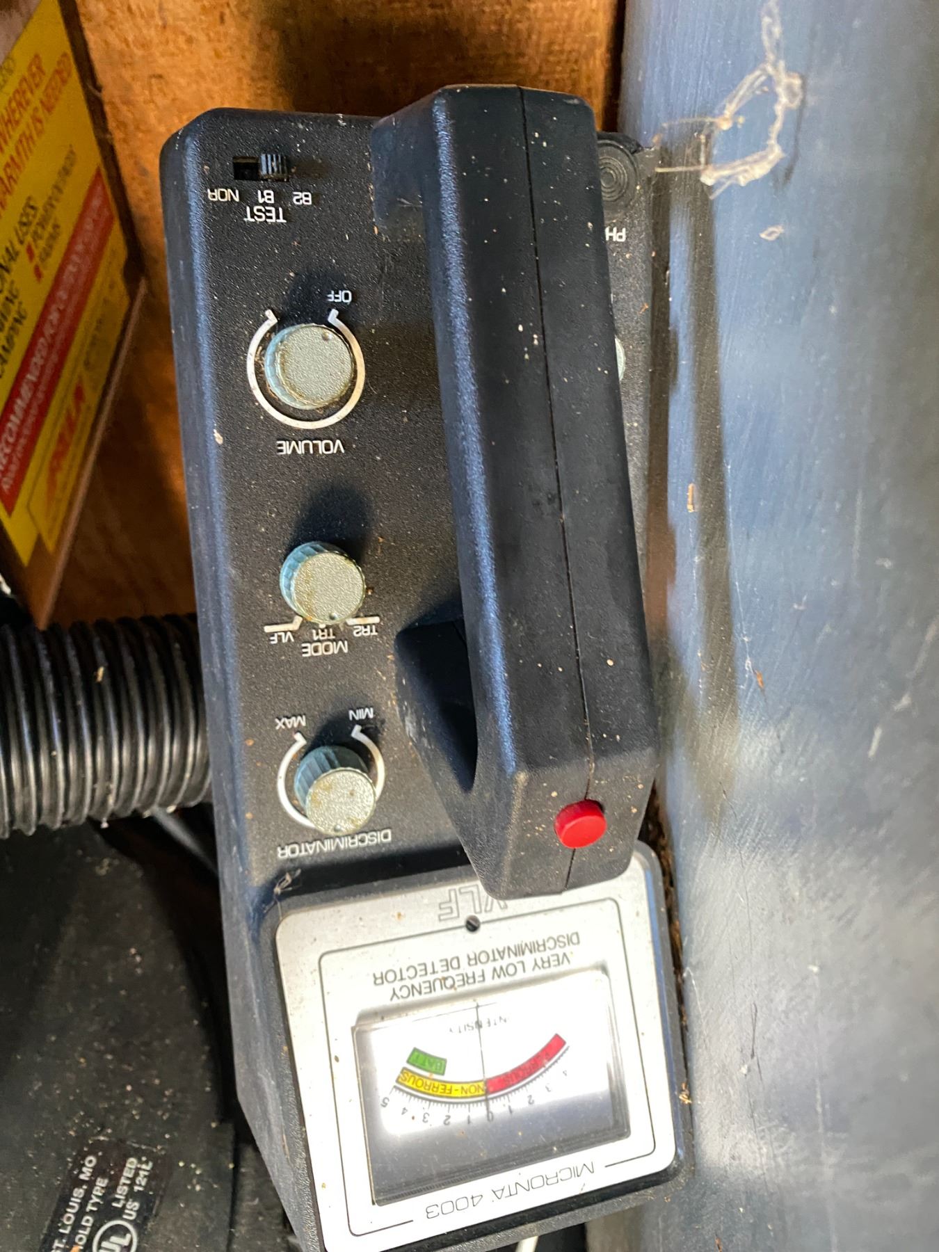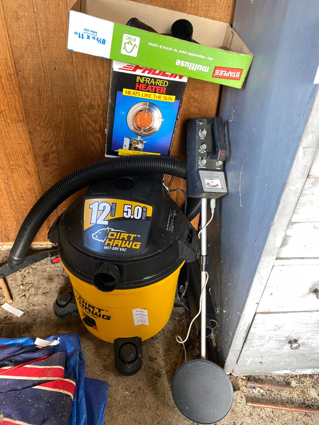 12 gallon 5.0 keak HP wet dry vac. Paulina Infra red heater, Micronta 4300 discriminator detector, metal detector. All untested. Pickup at 10 am