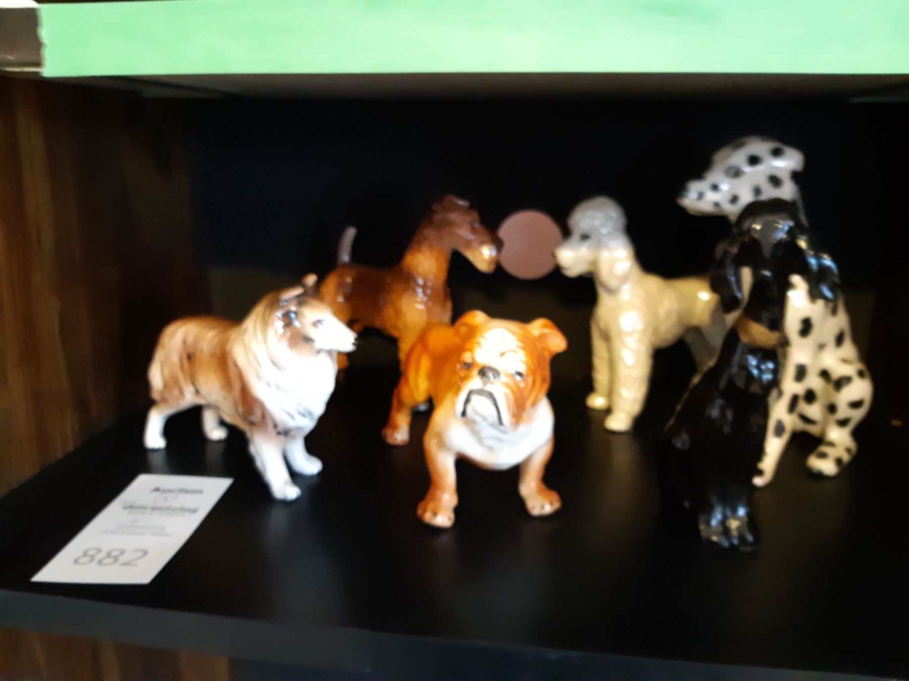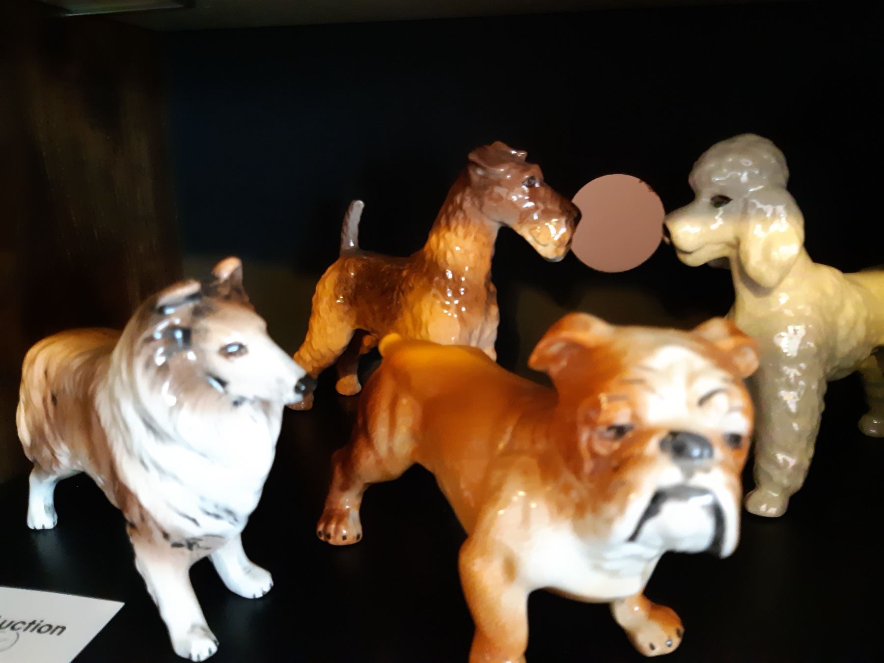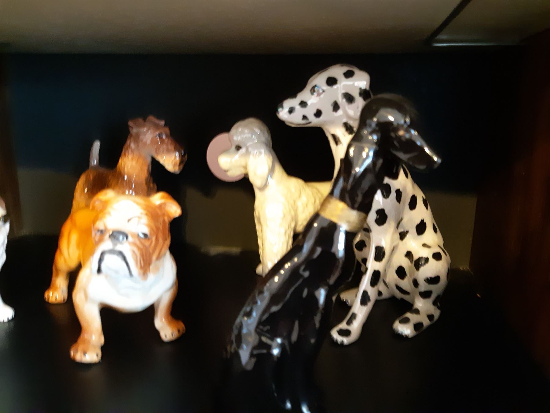 6 Ceramic figurines. Largest is 7" long. Please note the black dog figurine has been repaired. Bring packing. Pick up at 9 am.