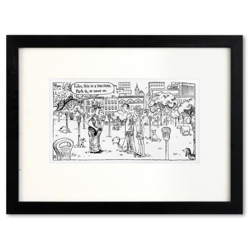 Enter a surreal and satirical world of twisted imagination and award winning creativity. Dog Park is an original pen & ink drawing on paper by Dan Piraro, creator of the critically acclaimed and award winning comic strip, Bizarro. This piece is hand signed, comes custom framed and includes a letter of authenticity. Measures approximately 14 x 21 (frame), 7 x 13 (image).This item requires special handling and may have a longer than usual turnaround.