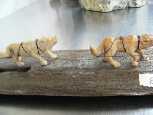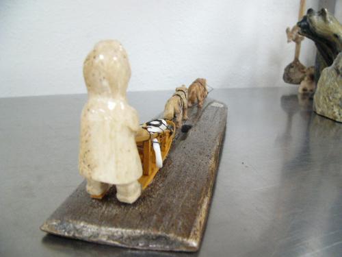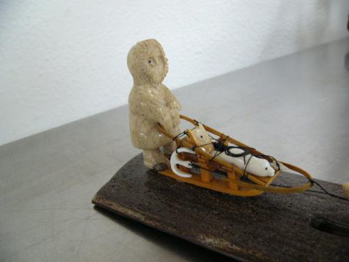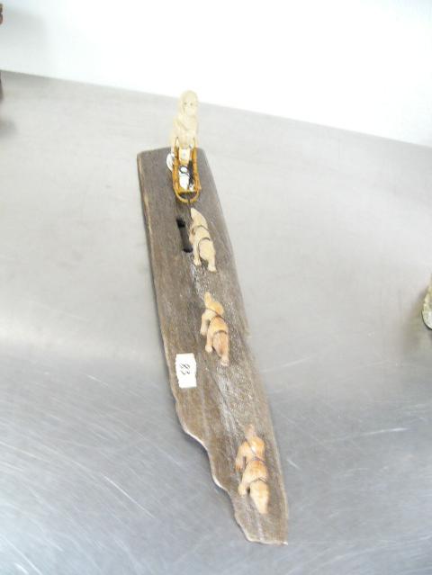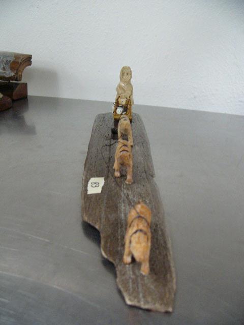 Dog sled scene made of bone- 15" long and 3" high with bone man and 3 bone sled dogs with ivory seal and ivory anchor by H. B. Slwooko ()