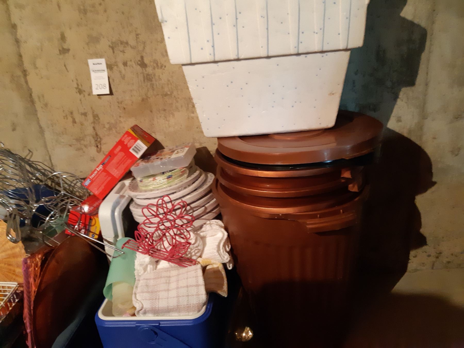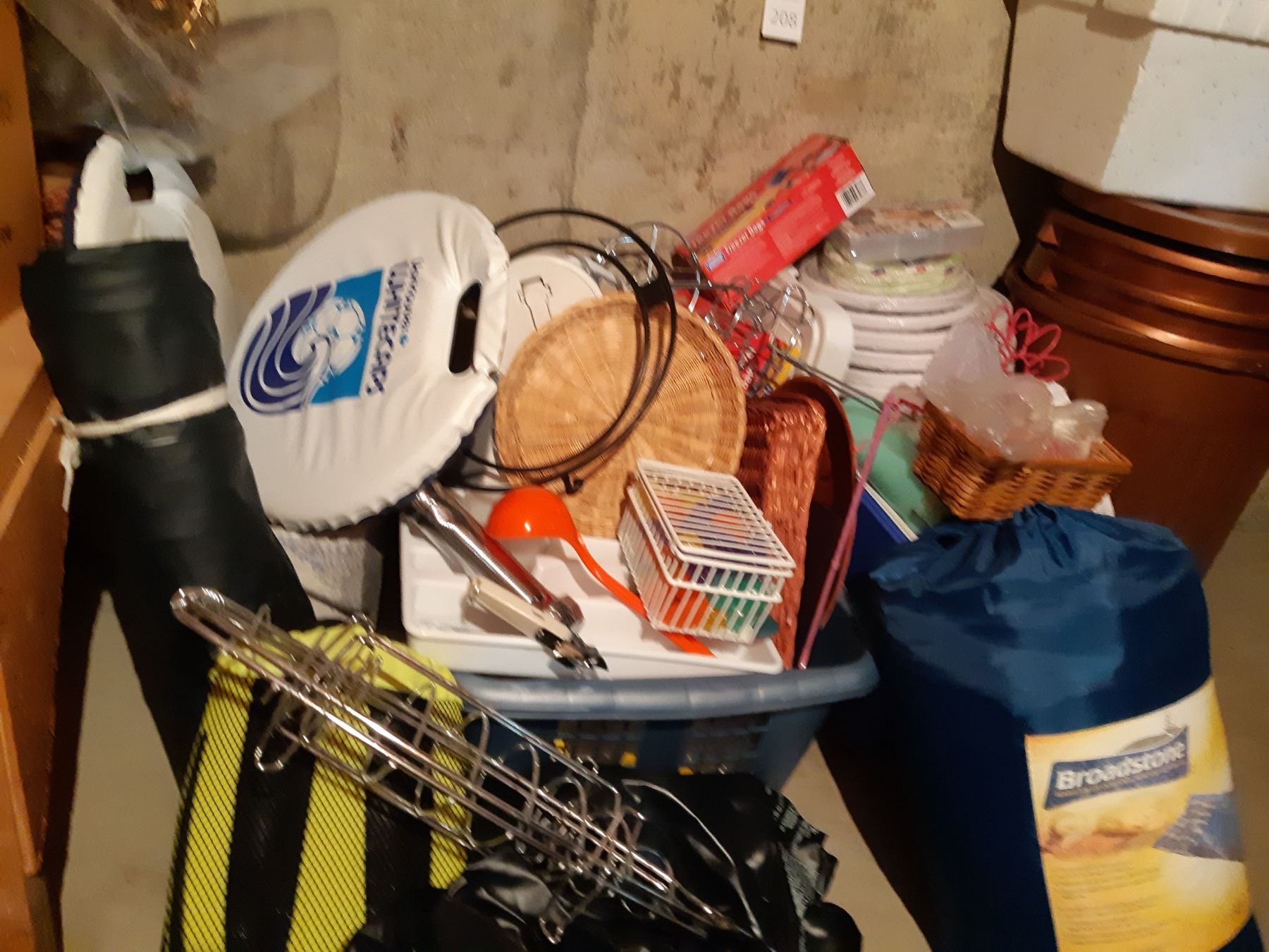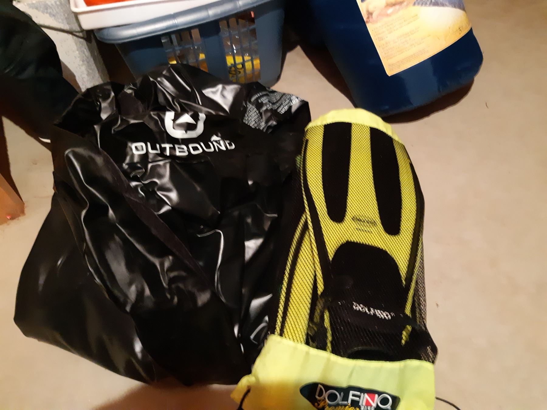 Dolfino diving fin, Oregon sleeping bag, Outbound floaty, freezer bags, flash lights, thermos, camping supplies and rags plus more. Please bring packing materials. Pick up at 9 am.