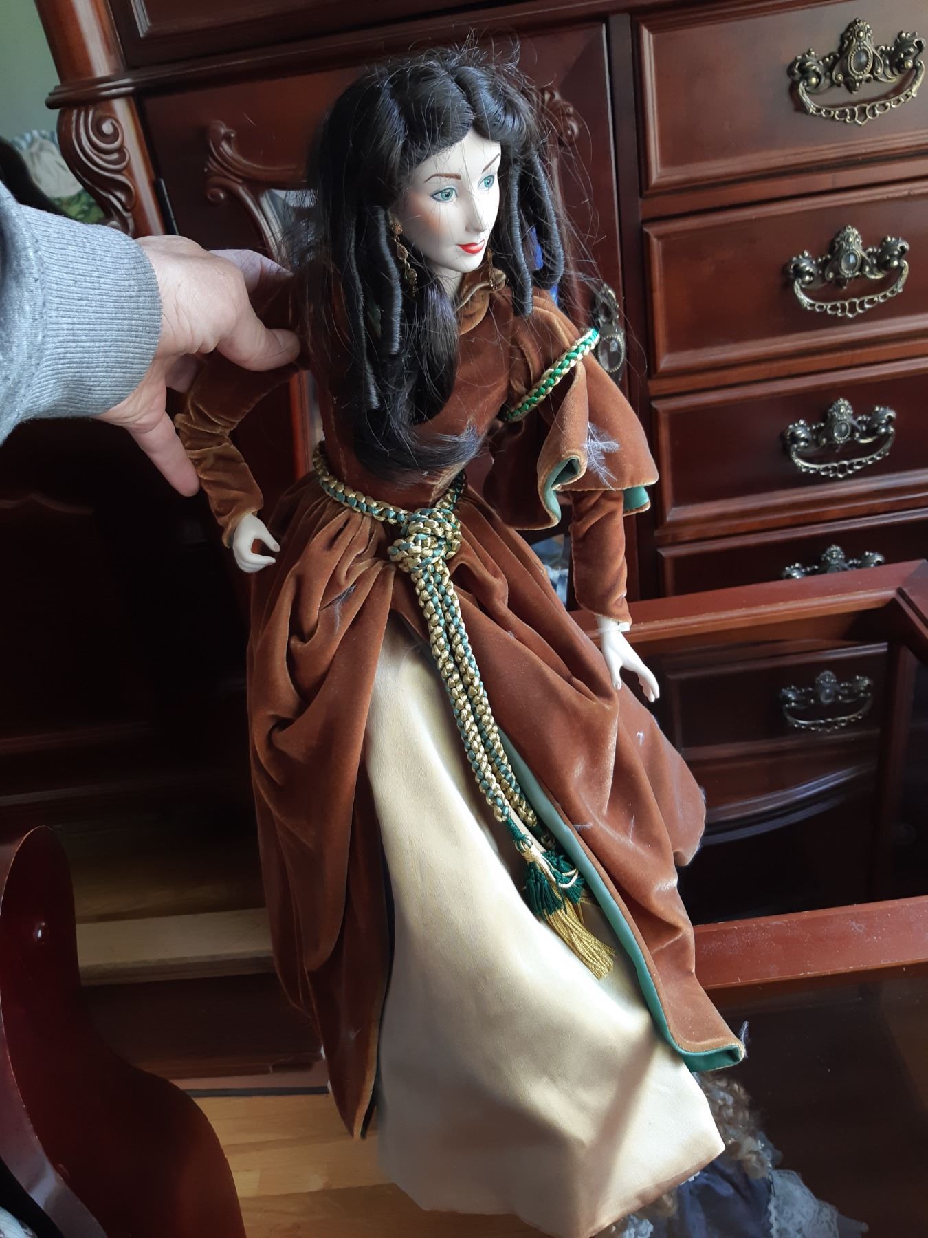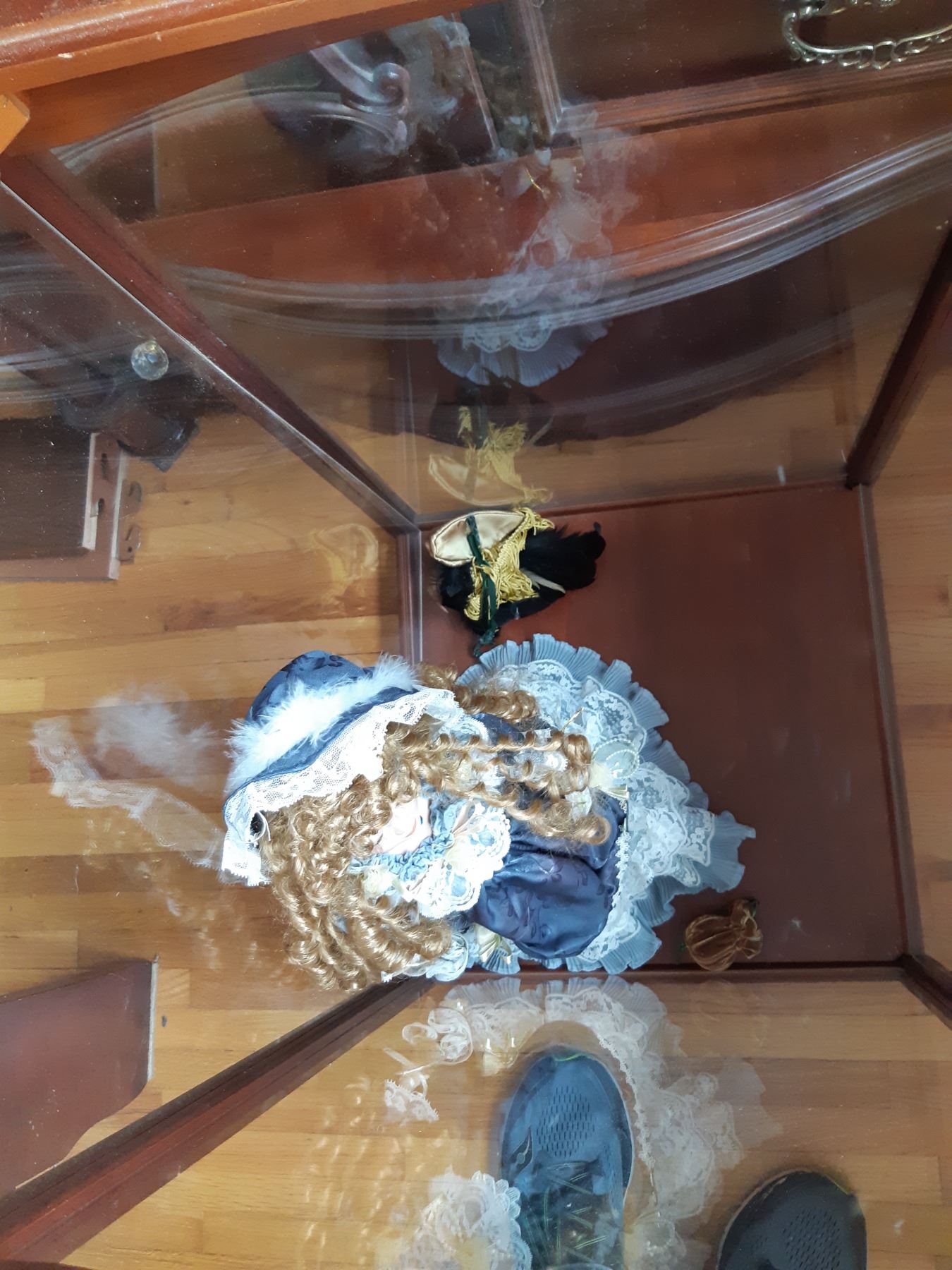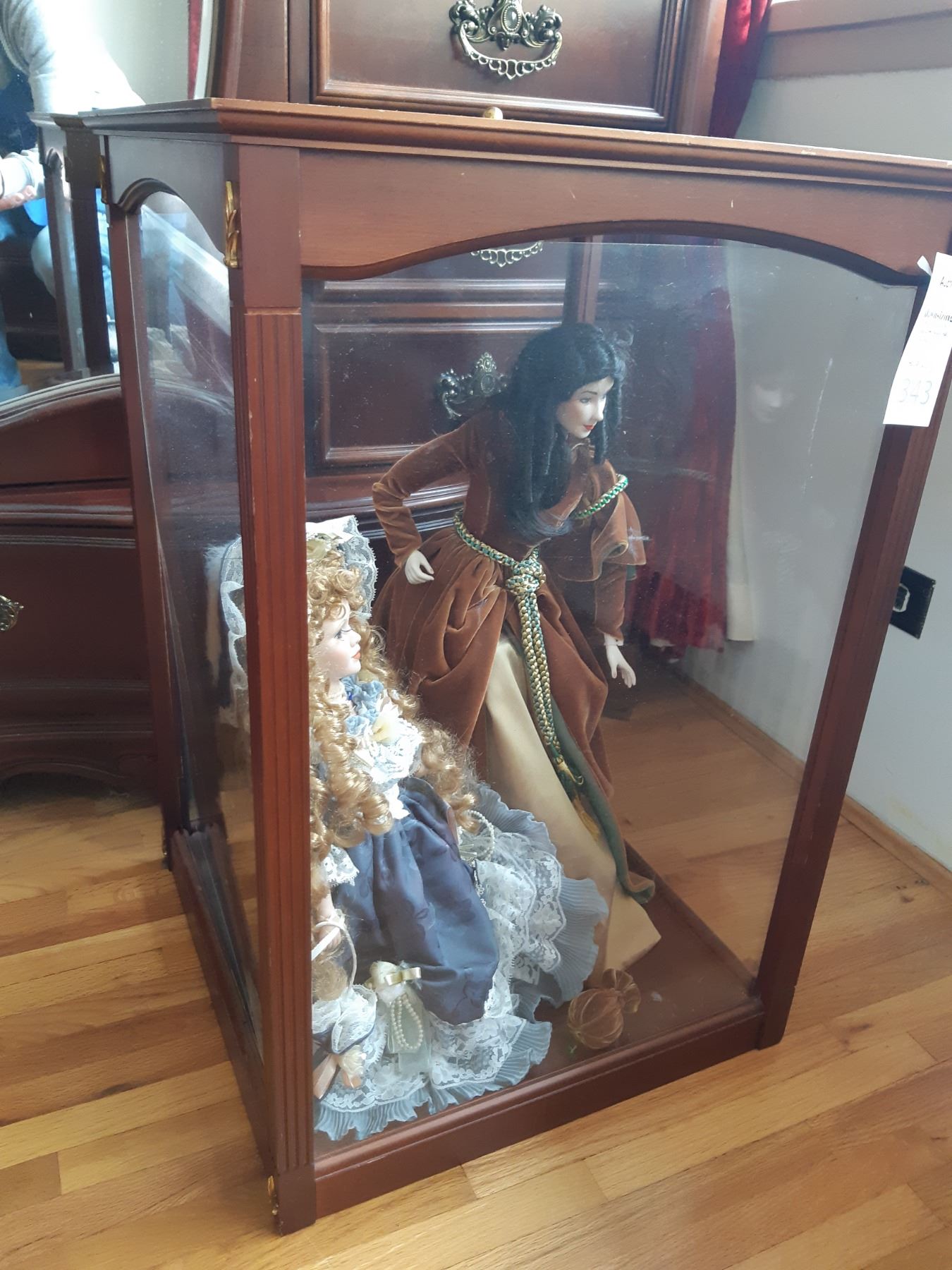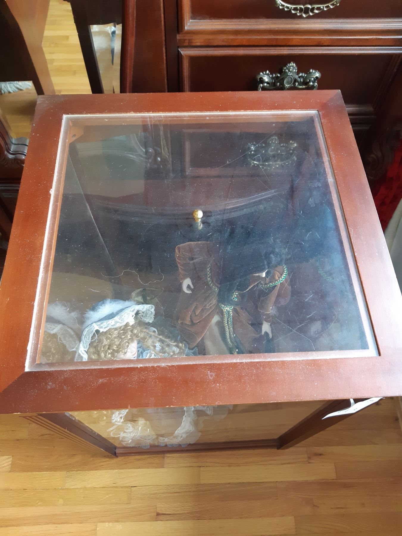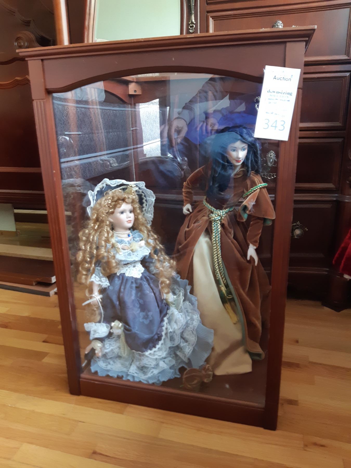 Display case wood and acrylic, with top opening 19x19x28. 2 Porcelain head dolls 22" each. Pickup at 10 am