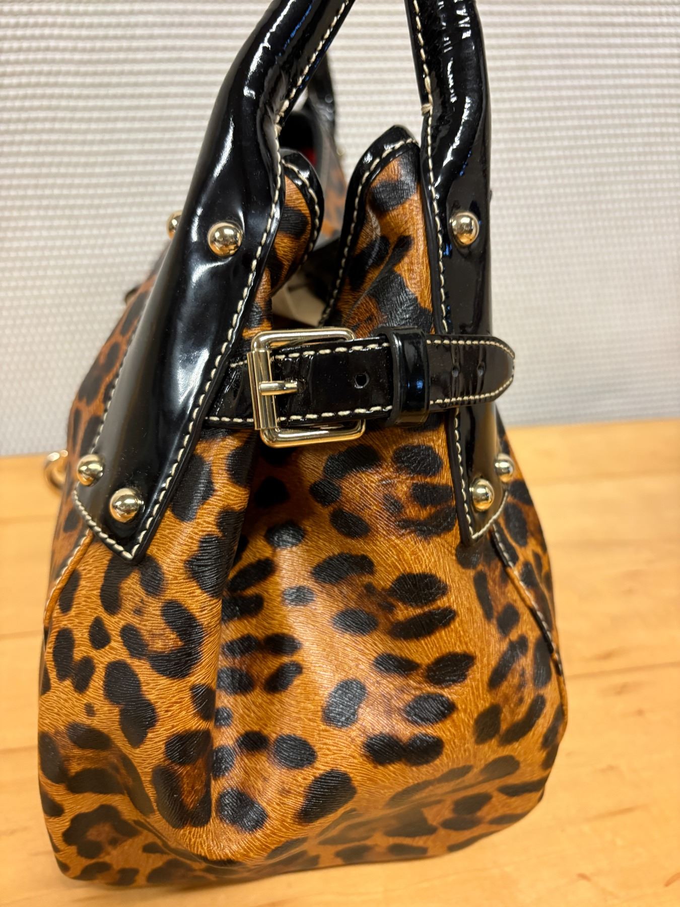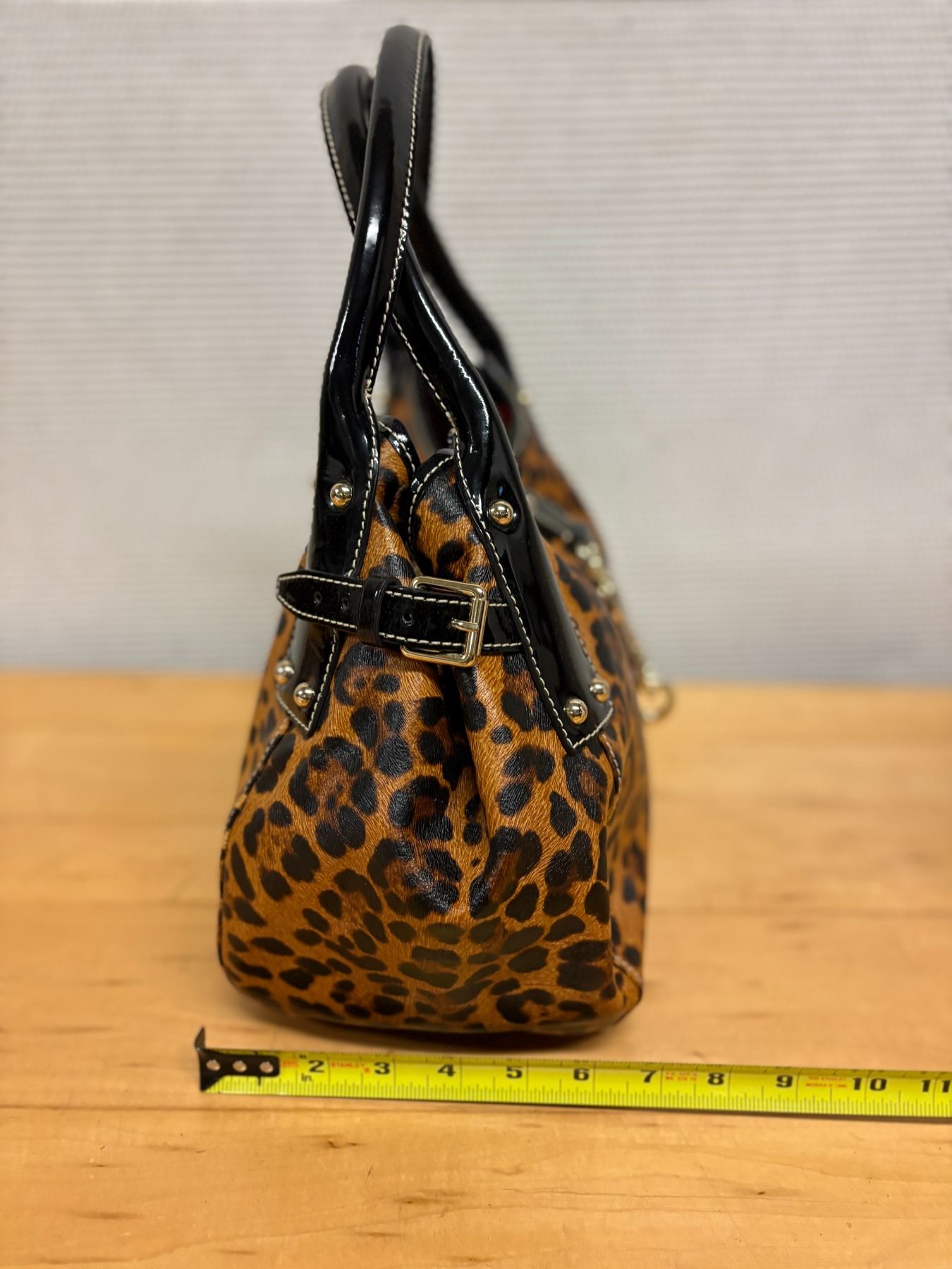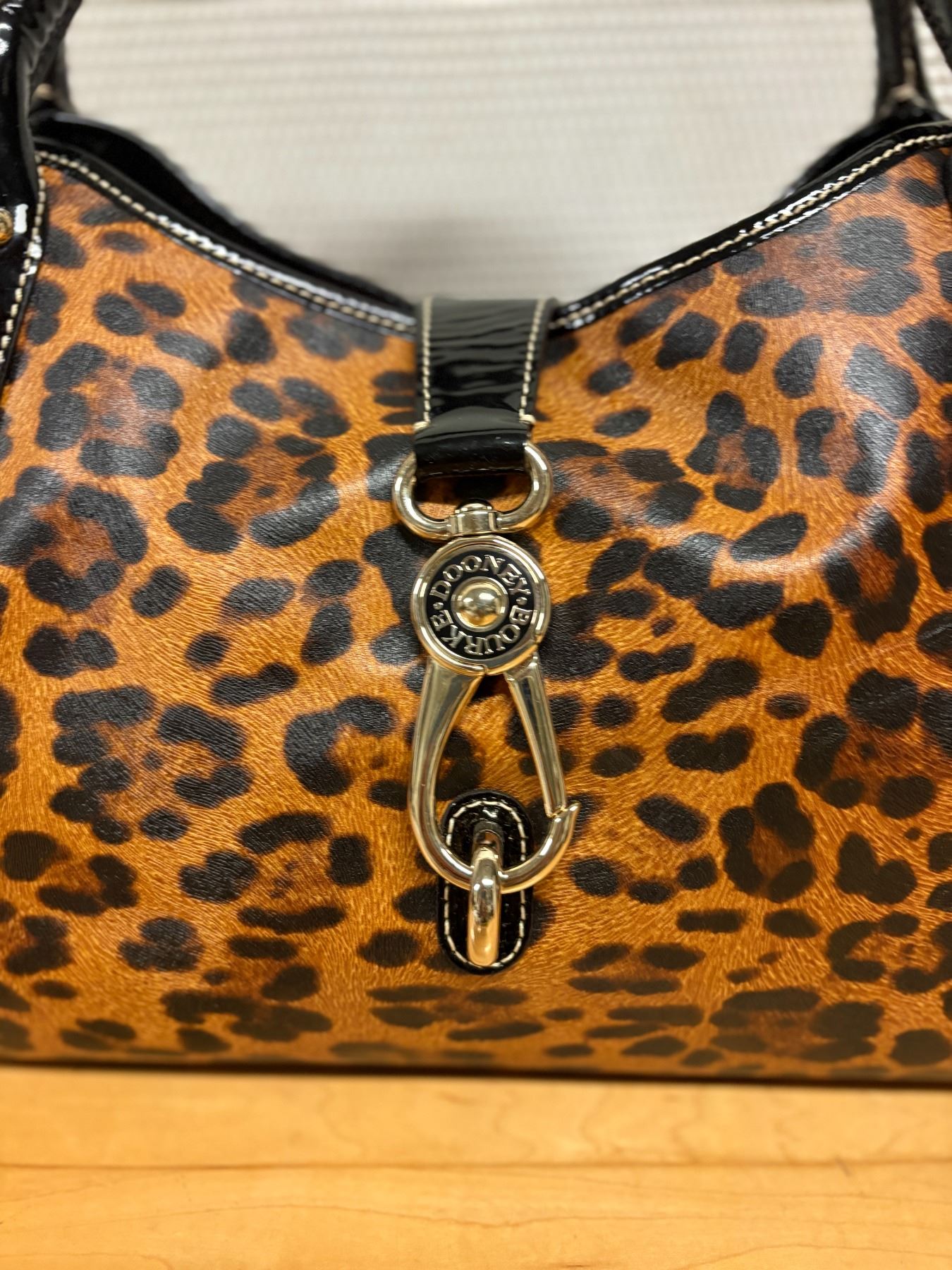 New Condition. Handles are slightly sticky. Dooney & Bourke Leopard Print Bag w/ Glossy Black Handles, Brass Clip Closure Accent.