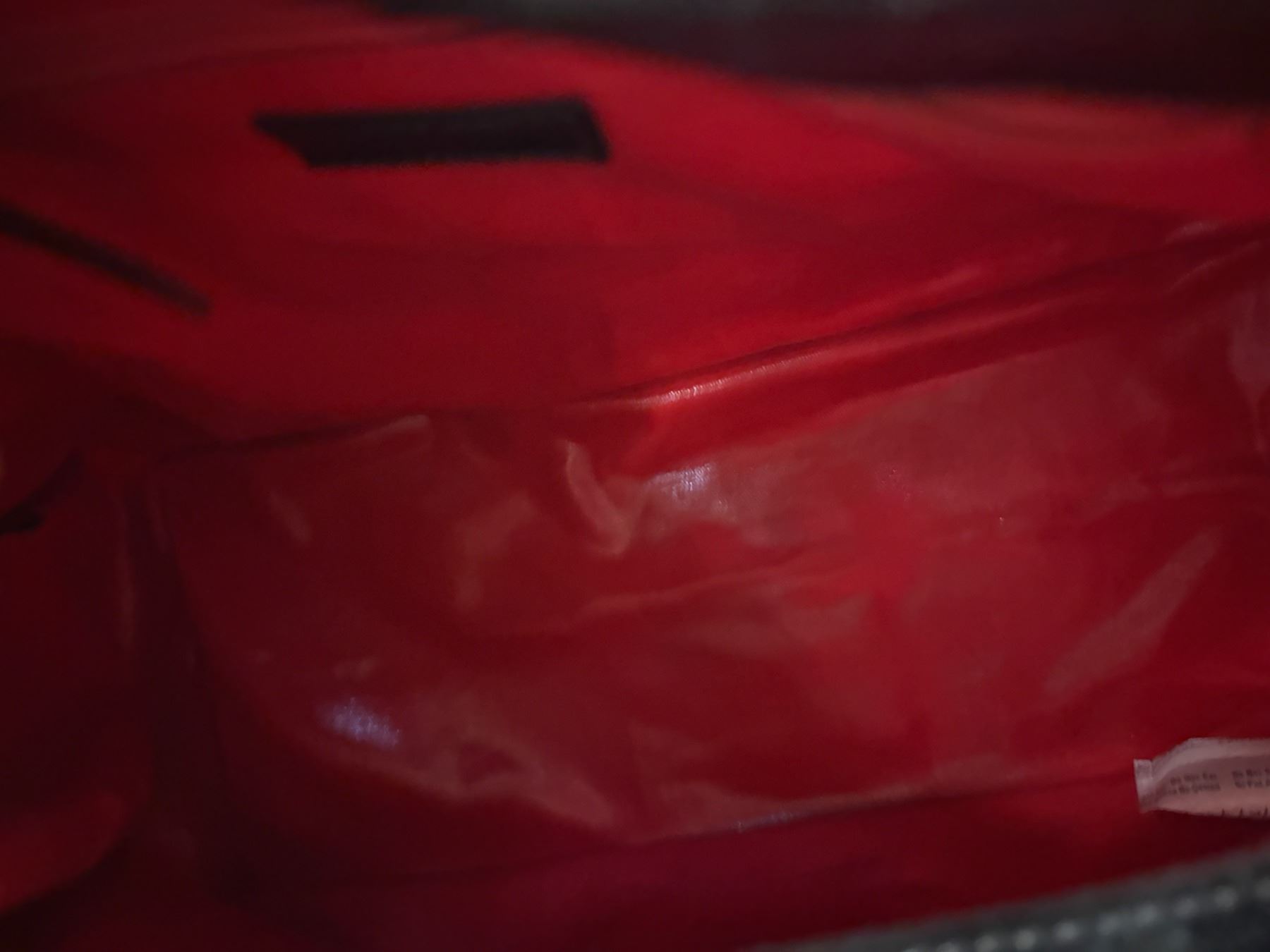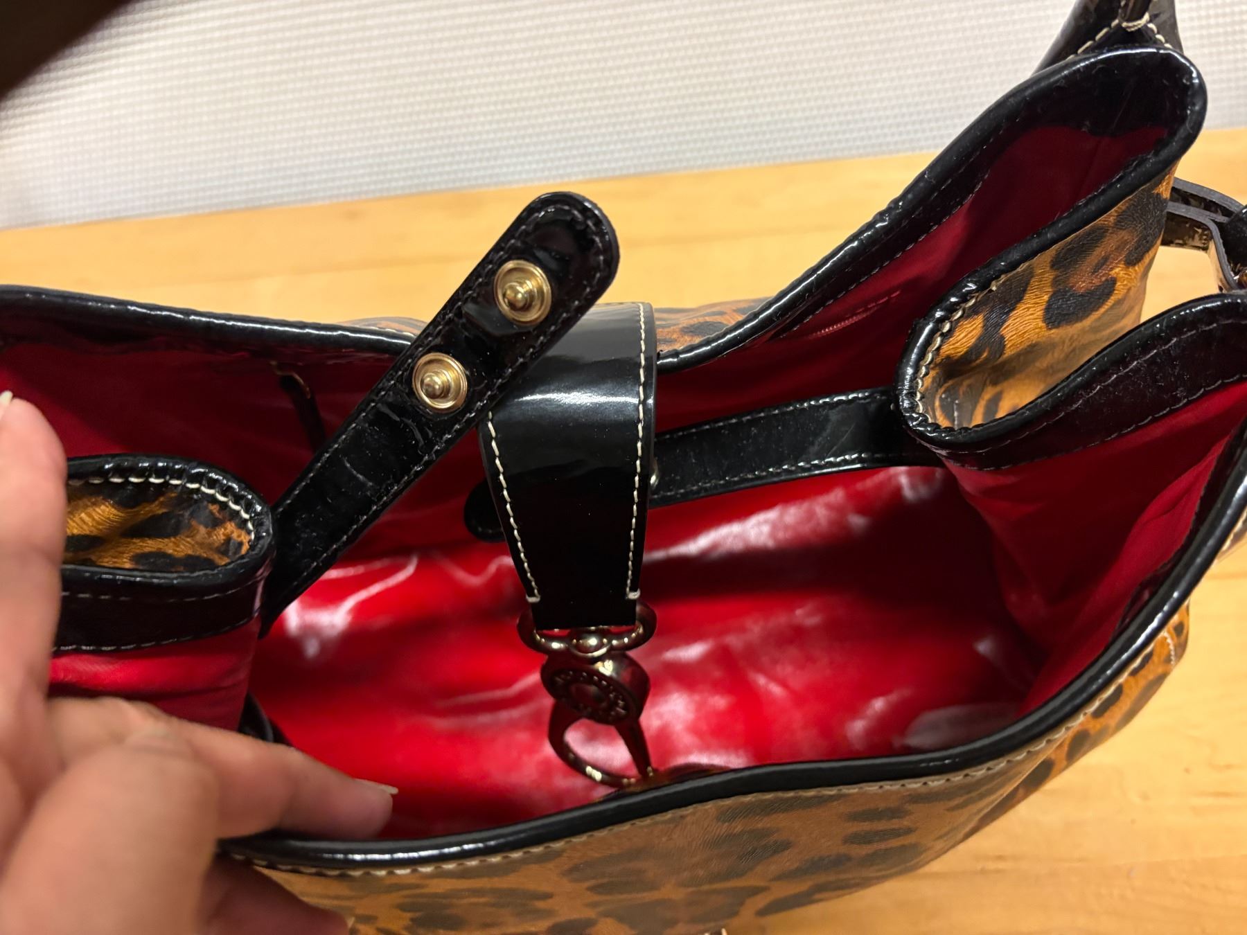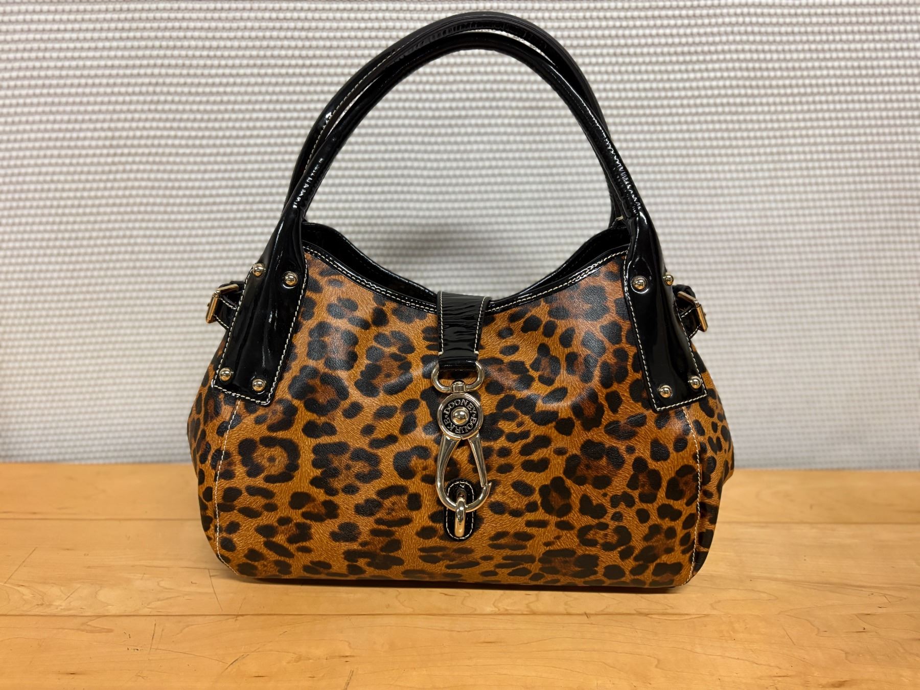 New Condition. Handles are slightly sticky. Dooney & Bourke Leopard Print Bag w/ Glossy Black Handles, Brass Clip Closure Accent.