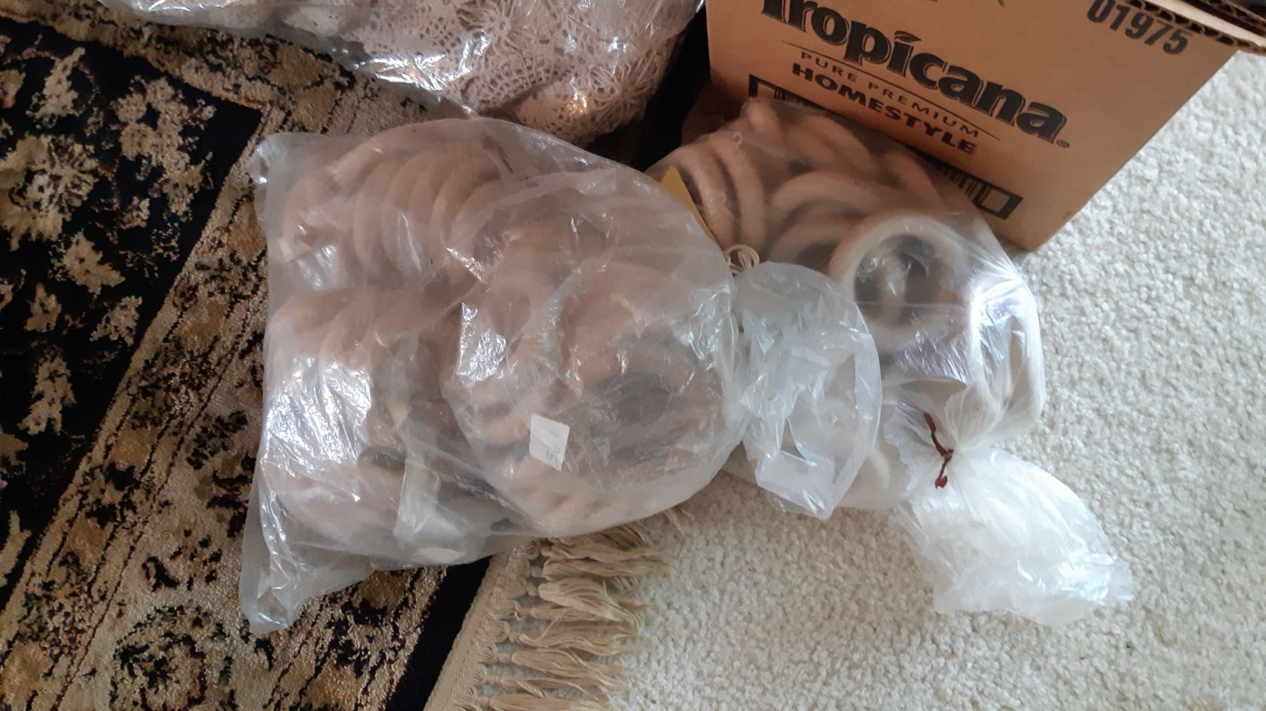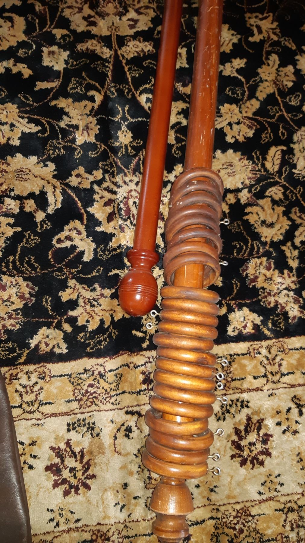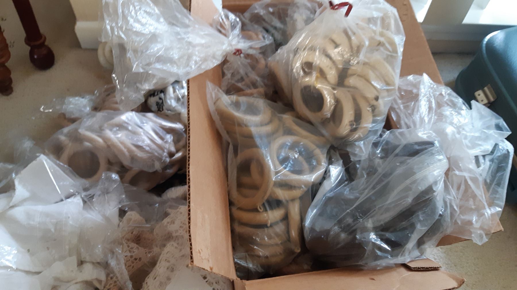 Longest rod is 78", shorter 43". Large bag of vintage table linen doilies. Box of curtain rings. All are used and not checked for completeness.