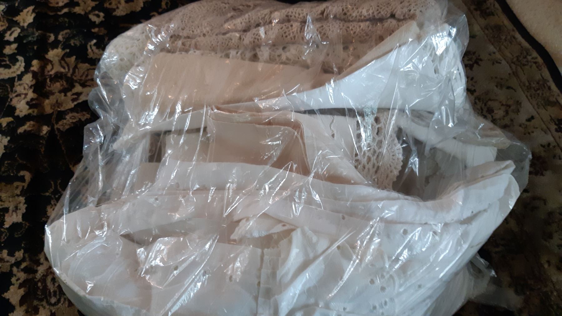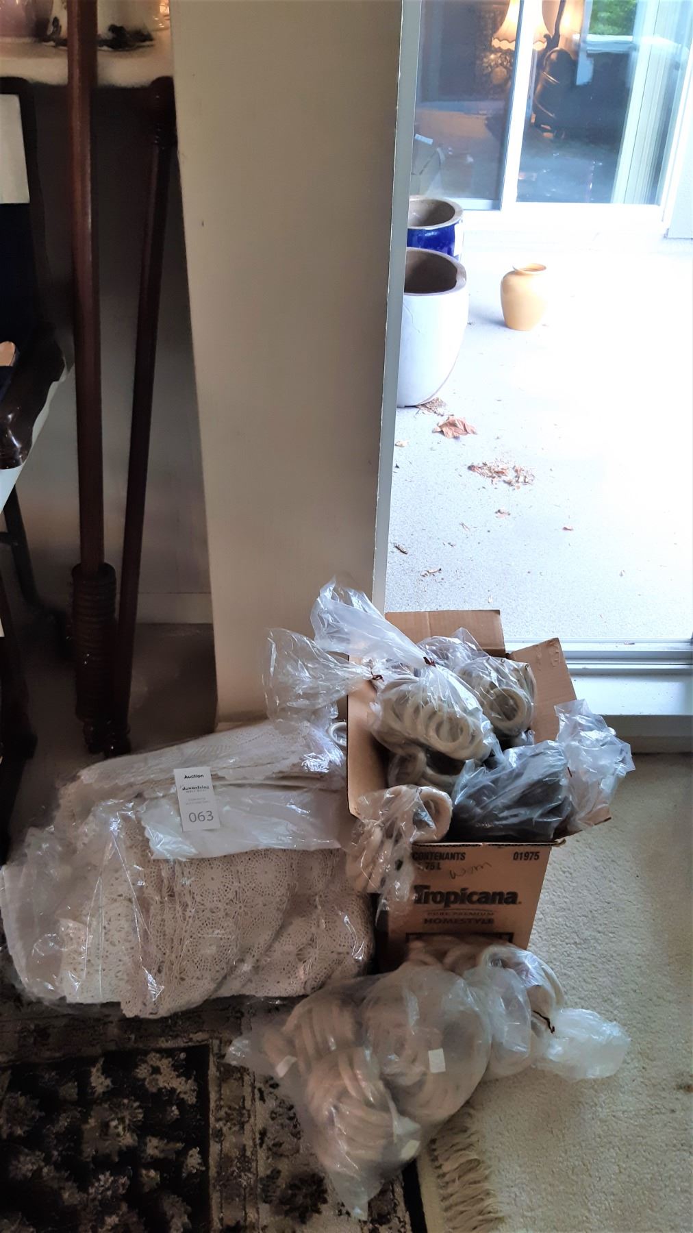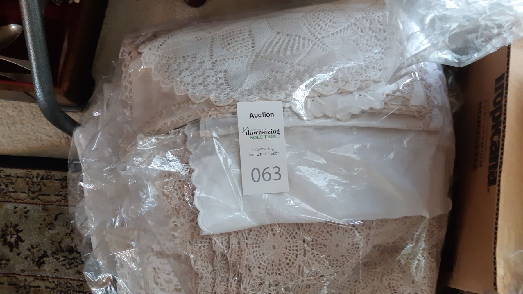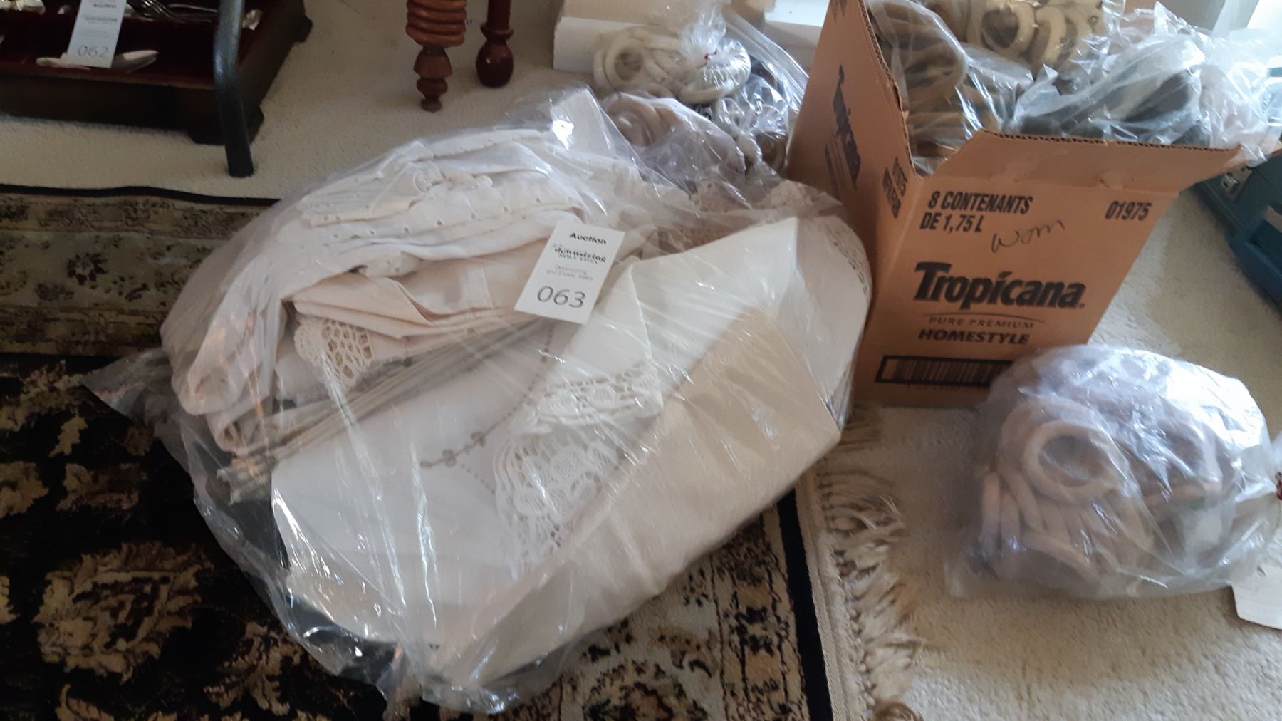 Longest rod is 78", shorter 43". Large bag of vintage table linen doilies. Box of curtain rings. All are used and not checked for completeness.