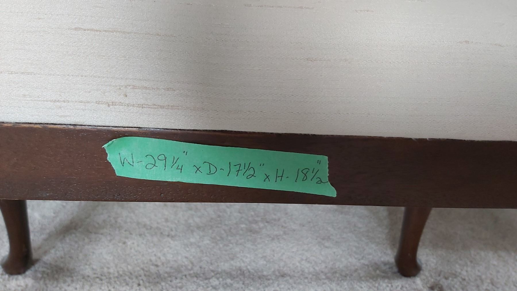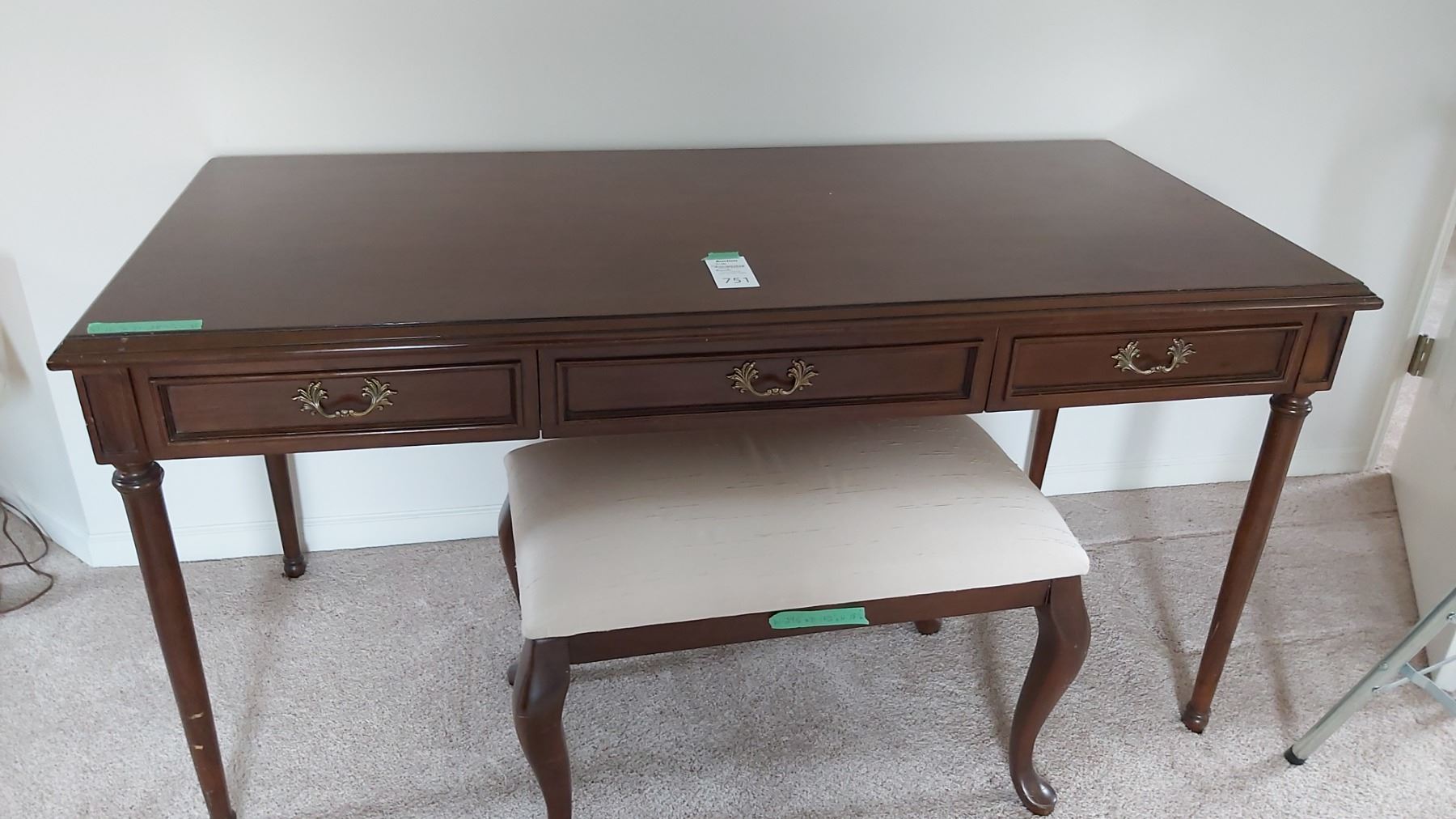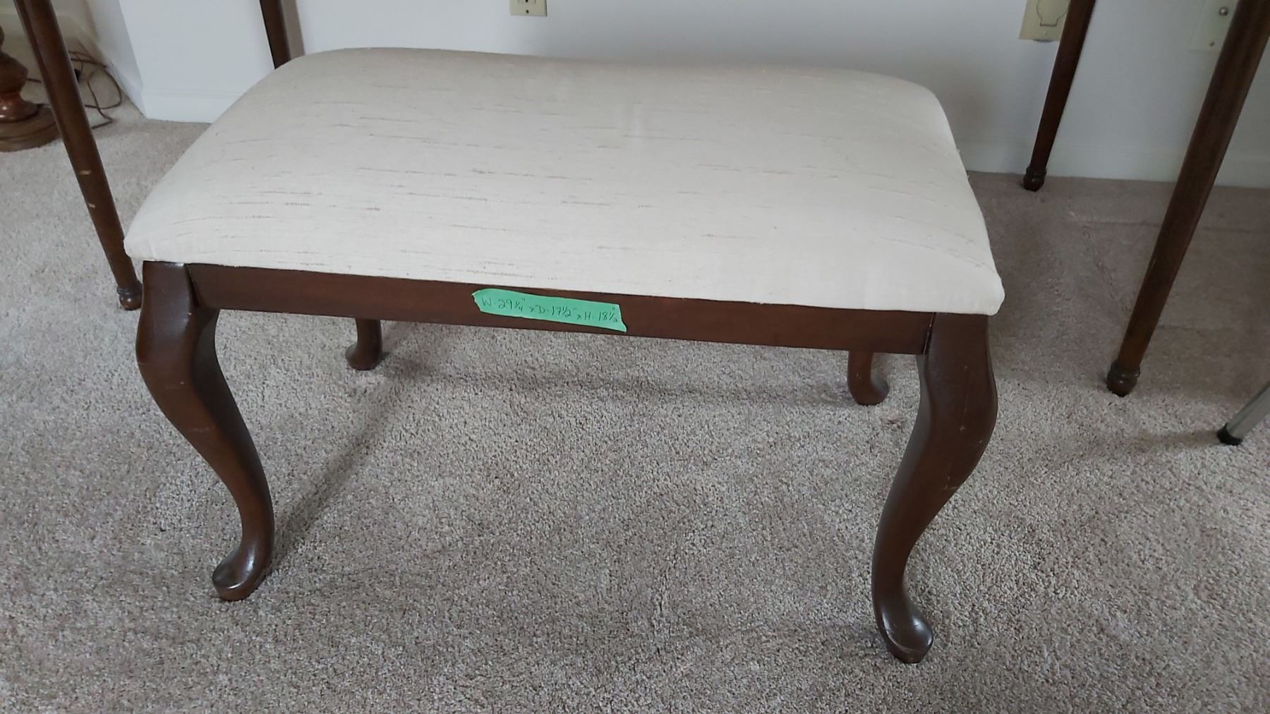 Dressing table 16x28x3, 3 drawers, please note scratches Bench with fabric seat. . Bring help to take down stairs. Pickup at 11 am