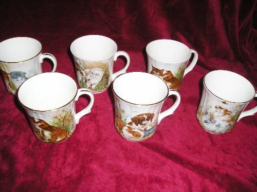 Duchess bone china English cups, w/scenes of cats/bunnies.