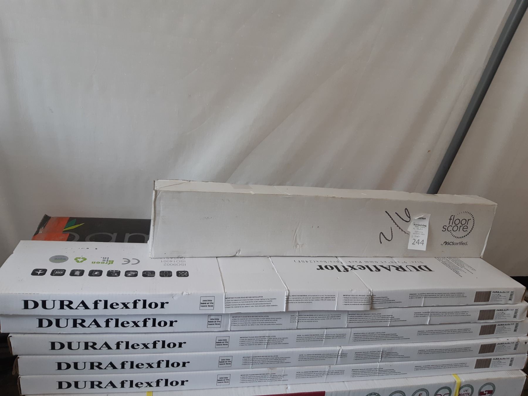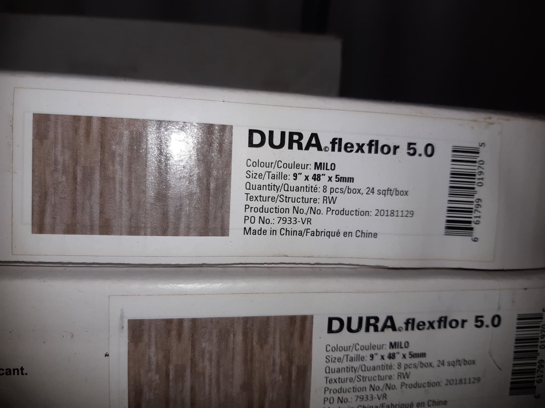 Five boxes of duraflexflor are 48" long. One box of floorscore flooring is 37" long. Unchecked for completeness
