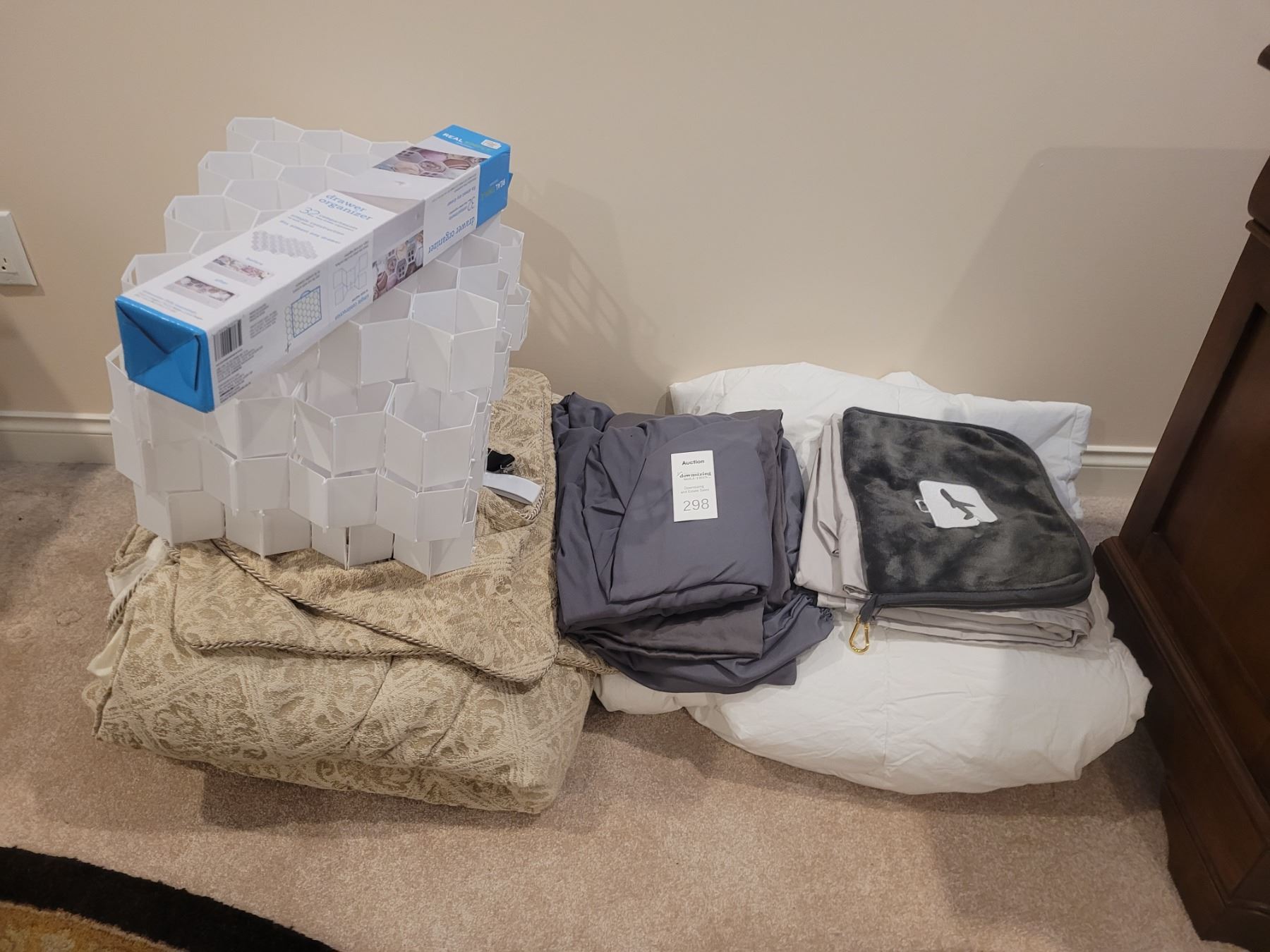 King size duvet and shams, sheets, duvet, drawer organizers. Pick up 9-10