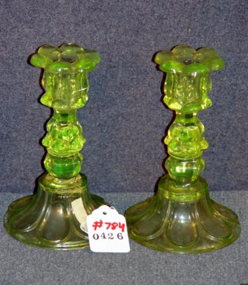 EARLY VASELINE GLASS 7" CANDLESTICKS- 2 X THE MONEY, PROVENANCE WALSTROM COLLECTION