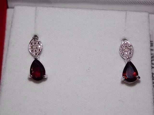 EARRINGS - 2.2 CTW PEAR FACETED GARNET & 2 DIAMONDS IN STERLING SILVER SETTING - RETAIL ESTIMATE $300