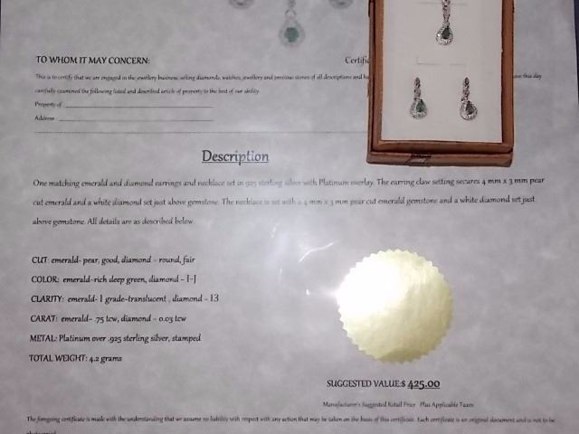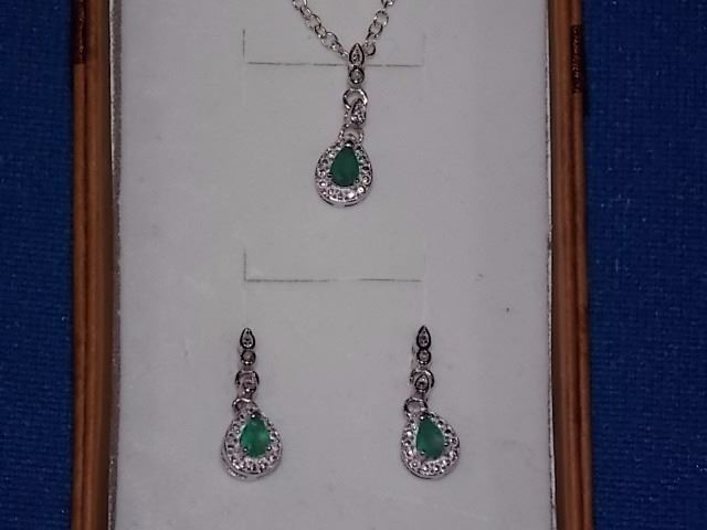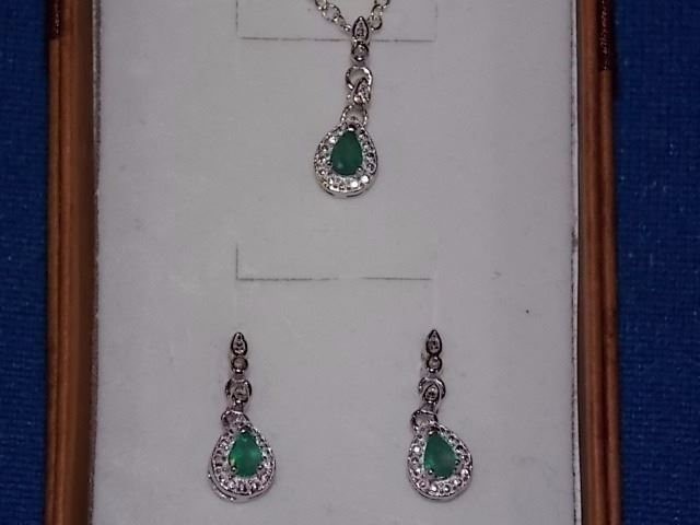 EARRINGS - NEW PEAR FACETED EMERALD & DIAMONDS IN STERLING SILVER SETTING - INCLUDES CERTIFICATE $425