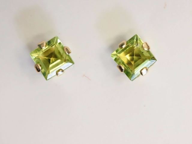 EARRINGS - SQUARE FACETED LIGHT GREEN PERIDOT IN 10K YELLOW GOLD 4 CLAW SETTING - POST & BUTTERFLY BACK - RETAIL ESTIMATE $250
