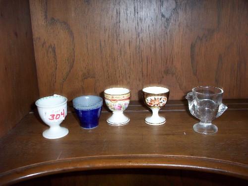 VARIETY OF EGG CUPS INCLUDING CHINA, POTTERY AND GLASS
