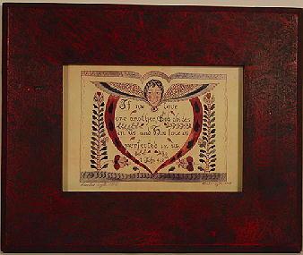 American, 20th C. (in manner of 19th C.), "Fracktur", pen, ink and watercolour drawing with quote from 1John 4:12, image 4 5/8"x6", framed, titled and ascribed on reverse, signed by "Anita and Randy Landis eigsti", copyright 1995.