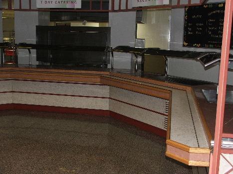 EMH FABRICATIONS STAINLESS STEEL & TILE SERVING COUNTER COMPLETE WITH CHILLED & HEATED UNDER COUNTER STORAGE, CORNER RETURN UNITS, TRAY & CROCKERY SHELVES, OVER COUNTER LIGHTING