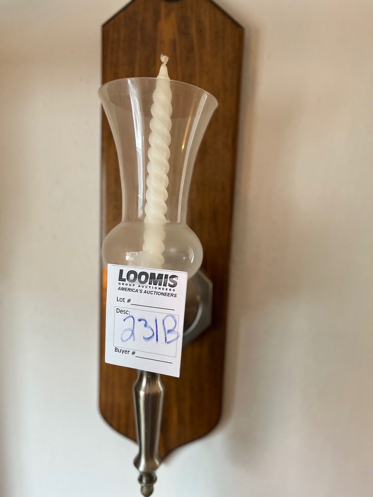 SPIRAL CANDLE IN GLASS WITH WOOD WALL MOUNT.