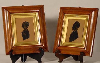. early 19th C., "Untitled", pair of silhouettes of a man and a woman facing left, black, heightened in gold, images 4" x 3 ¼", in gold mats, wood frames of later date.