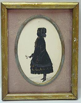 , circa 1820-1840, "Untitled", (silhouette of young girl holding a sprig of flowers, in black, heightened in gold, facing left), oval image 5 3/8" x 3 5/8", matted and framed. Note: glass missing.