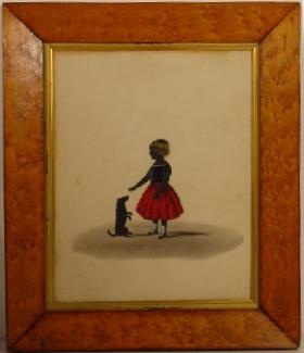 , circa 1825-1835, "Untitled", (silhouette of a young girl in black with her dog), heightened in gold and overpainted red dress, image 9 3/8"x7 3/8", in original curley maple frame.