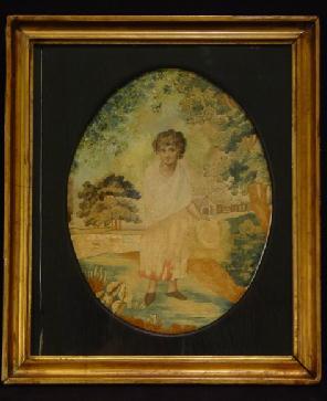, circa 1800-1810, "Untitled", (girl in a landscape setting with building in background), mixed media, silk embroidery with painted facial features on silk, oval image 12"x9", framed.