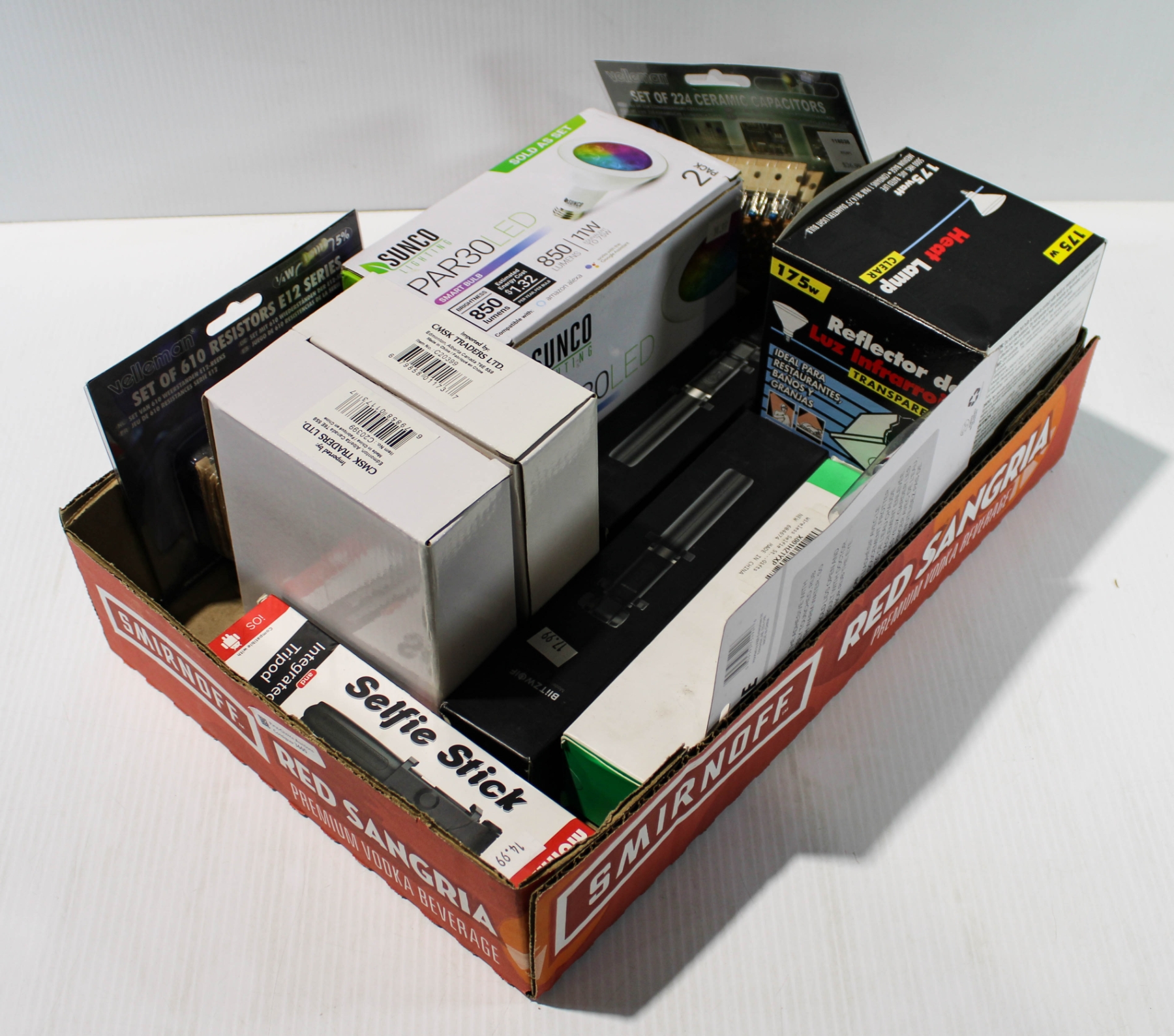 INC. SUPER GLUE, SELFIE STICKS, PACK OF 610 RESISTORS, SECTION CUP PULLING TOOL, COLOR CHANGING LED LIGHT BULB