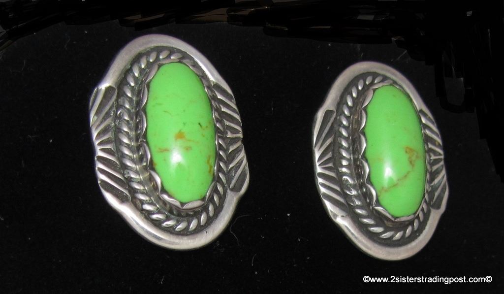 Beautiful bright apple green turquoise set in a classic Navajo sterling setting. Turquoise measures 14 mm long by 6 mm wide, the sterling setting is 20 mm long by 15 mm wide and weigh 3 grams each for a total of 6 grams. Earrings are stamp sterling and signed EYD by the artist. Earring backs are stamped sterling and have a pictorial hallmark NOTE: this could be Orvile Jack Turquoise from northern Nevada it is known for is distinctive yellowish green color
