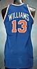 On the left front tail of the jersey is the "Sand-Knit" New York Knicks exclusive tag has been removed (stitching remains). Below that is an additional "Sand-Knit" manufacturer's tag with the jersey size "42" on it. Across the front of the jersey is "NEW YORK" in orange on white tackle twill. Below that and on the back is the player number "13" in orange on white tackle twill. Across the back is "WILLIAMS" in white tackle twill. The jersey shows good game-use and appears to have no alterations of any kind except for the removed tag.