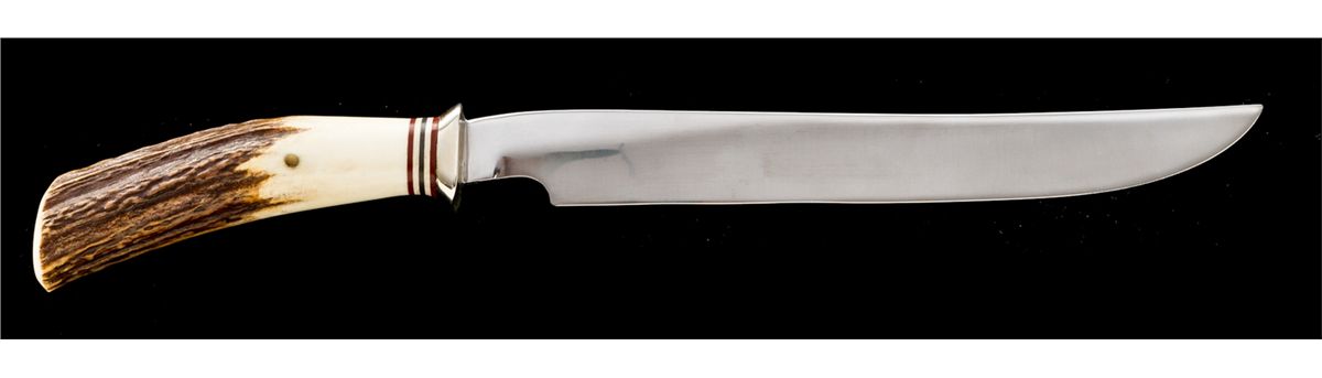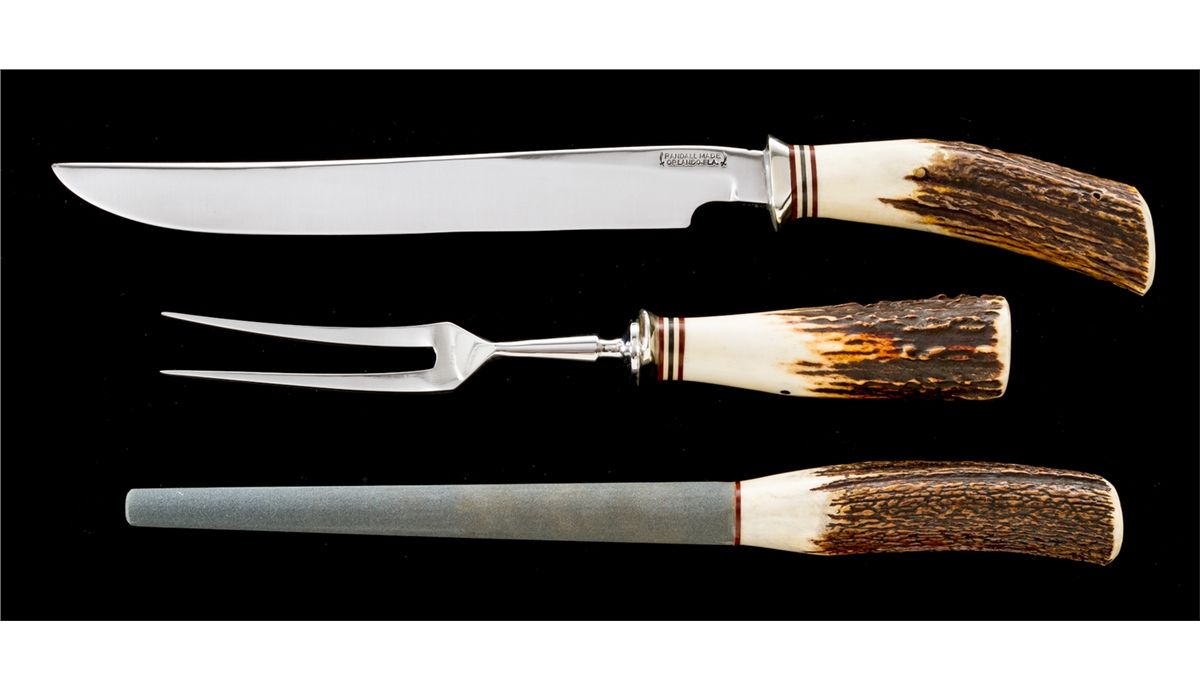 Early Three-Piece Randall Carving Set, pinned stag handle, nickel silver hilts, with five spacers. Overall lengths are as follows: knife 13-3/4''; fork 10-1/4''; sharpening steel 12''. Condition to all is excellent, showing signs of light use. Nickel silver parts with mild toning. Est.: $1,800-$2,400.
