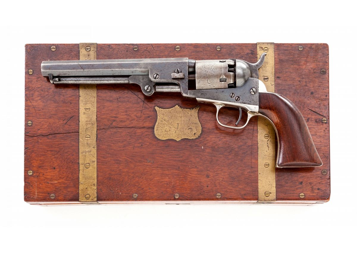 Early Cased Colt 1849 Pocket Model Revolver with accessories, #82785, .31 cal., 6'' blue barrel, case hardened frame, silver backstrap and triggerguard, one-piece walnut grips, with clear stagecoach scene to cylinder. In brass strapped maroon-lined mahogany case with iron bullet mold, unmarked eagle flask, and colt marked nipple wrench of later vintage. Mfg'd 1853. Condition is about fine retaining approx. 85%+ lightly thinning original blue to barrel assembly; cylinder with traces in protected areas, with crisp scene, fresh nipples, and matching numbers. Frame shows hints of original case cases that have toned and speckled somewhat. Gripstrap and triggerguard retain almost all of their (possibly later done) silver plating. Grips show fractional shrinkage with darkening near metal surfaces and now retain an even oil type finish. Action remains crisp, bore is fine. Bullet mold remains in fair condition with light to moderate pitting and general knackering; flask is a well-aged modern replacement, as is combination tool. Case with scuffs, scratches, and a minor fracture emanating from the left side of central shield. Est.: $1,800-$2,400. (Antique)