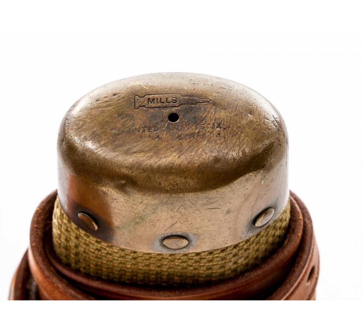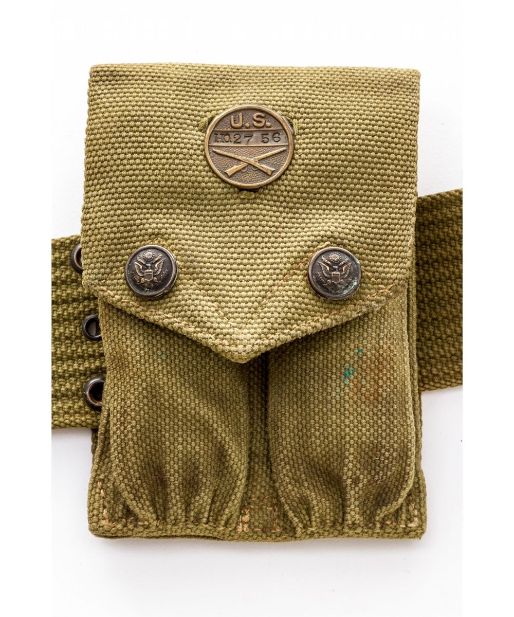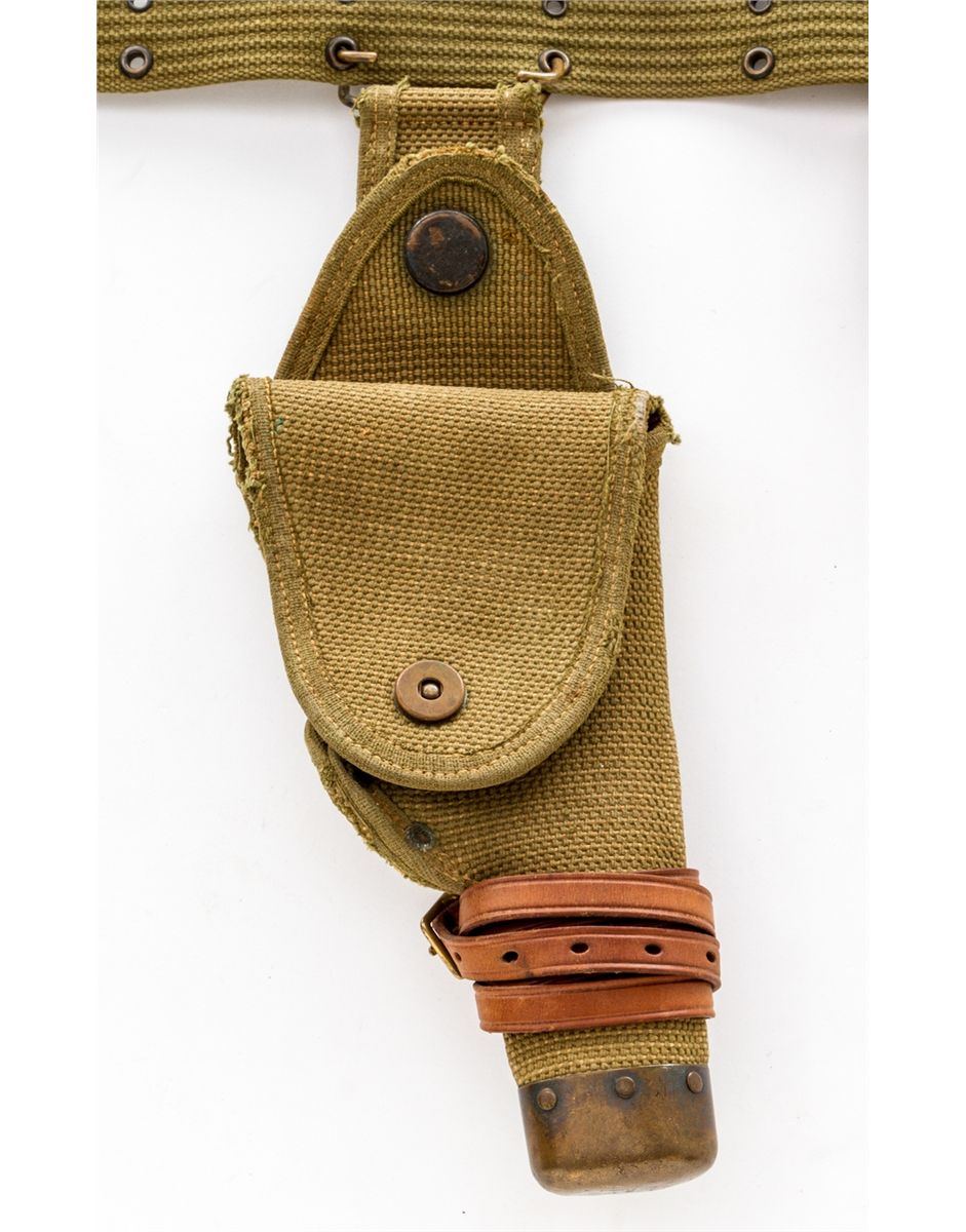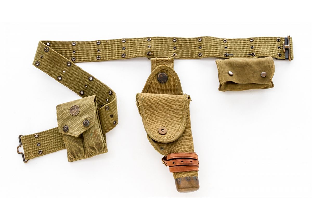 Early Mills Pistol Belt Rig for 1911 Semi-Automatic Pistol, with canvas holster with Mills bullet insignia on inside flap, dated 1914; early 1912 Pattern green belt by Mills with no snaps for mag pouch, dated 1916; Mills marked green canvas 1st aid pouch; canvas two-cell rimmed eagle snap mag pouch with ''U.S. HQ 2756'' insignia on front flap; with U.S. Army Bauer & Black 1907 dated 1st aid kit. Condition is fine to near excellent overall, with some fraying to rare canvas holster, and lacking gussets to 1st aid pouch (detracts little). Est.: $600-$800/lot.